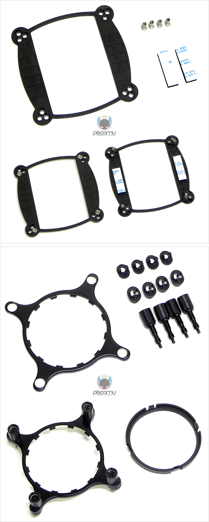 제품 포장은 상위 모델과 동일한 방식으로 마분지 재질의 캡 형태 포장식으로 깔끔하게 되어 있으며, 구성품은 본 쿨러를 비롯해, 기본 제공 120mm 팬, 부속품으로 나뉘어져 있겠습니다. 부속품에는 인텔용 백플레이트와 리텐션 클립, AMD용 백플레이트와 리텐션 클립으로 크게 나뉘어지며, 공용으로 사용되는 리텐션 링, 공용 볼트, LGA 2011용 볼트, 클립 가이드, 팬과 라디에이터 장착에 사용되는 볼트, 양면 테이프이 제공되는데, 역시 상위 모델과 동일하겠습니다.