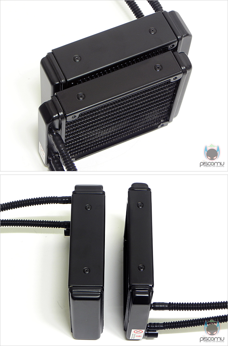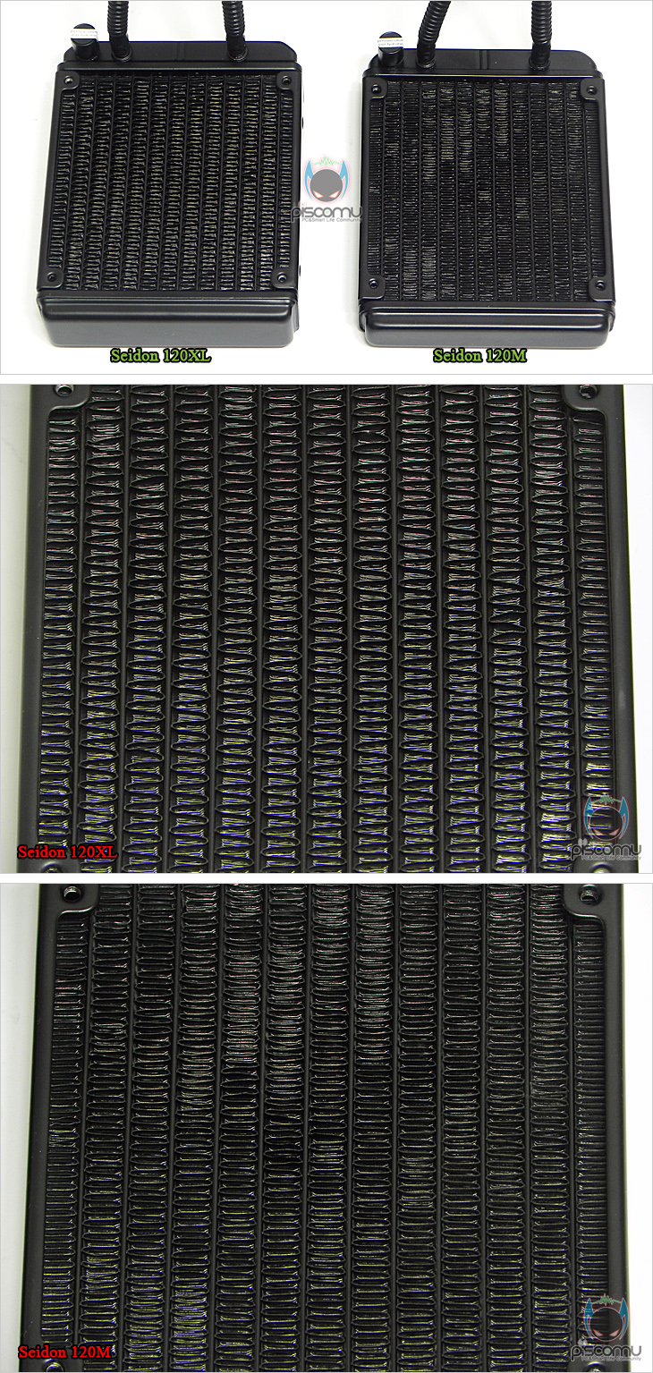 Seidon 120XL을 살펴보겠습니다. 외형적인 모습은 앞서 출시한 Seidon 120M과 큰 차이가 없습니다. 기본적으로 블랙색상을 가진 것도 동일합니다. 하지만, 앞서 말했듯이 Seidon 120XL이 Seidon 120M보다 상위 모델이기 차이점은 있습니다. 가장 큰 차이점은 바로 라디에이터 두께 부분으로, 하위모델인 Seidon 120M이 전형적인 라디에이터 두께 28mm였다면, Seidon 120XL은 이보다 10mm 두꺼운 38mm 두께를 가졌습니다. 일반적으로 두께가 커지면, 내부 수냉량이 많아져 성능에 차이를 보이는데, 이 두께부분을 차이점을 두고, 이번 모델명의 XL를 eXtra Large로 해석할 수 있겠습니다. 또한, 라디에이터의 추가적인 차이점도 발견할 수 있는데, 바로 핀 배열 부분입니다. 하위 모델인 Seidon 120M경우 촘촘한 배열을 가졌지만, Seidon 120XL경우 이보다는 조금 간격이 높은 핀 배열을 가지고 있겠습니다. 폭은 13폭으로 동일하겠습니다.