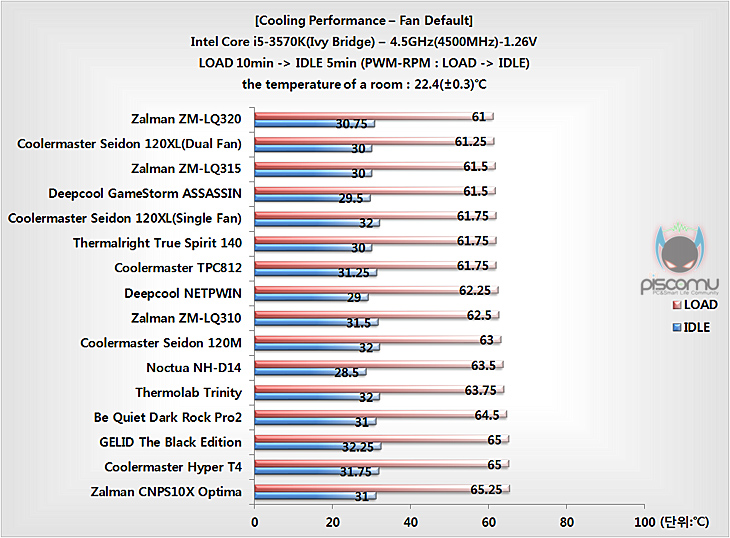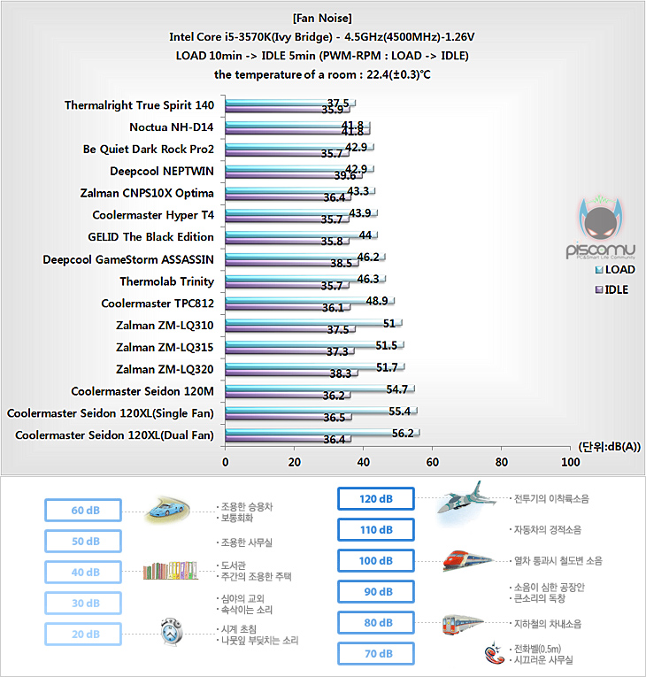 끝으로, 팬 소음을 측정해 본 결과, 앞서 속도 영향을 그대로 이어받아, 듀얼팬일 경우 LOAD에선 소음이 다소 있는 편이며, IDLE에선 저소음에 가까운 정숙한 모습을 보여줬습니다. 싱글팬 역시도 결과를 비슷 했습니다. 이전 모델인 Seidon 120M과도 비슷한 결과인데, 이는 역시 동일한 팬이라는 점과 팬 속도 범위가 600~2400RPM이라는 넓은 범위에서 가져오는 결과라 할 수 있겠습니다.