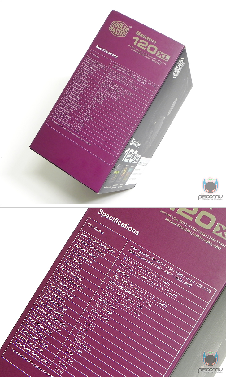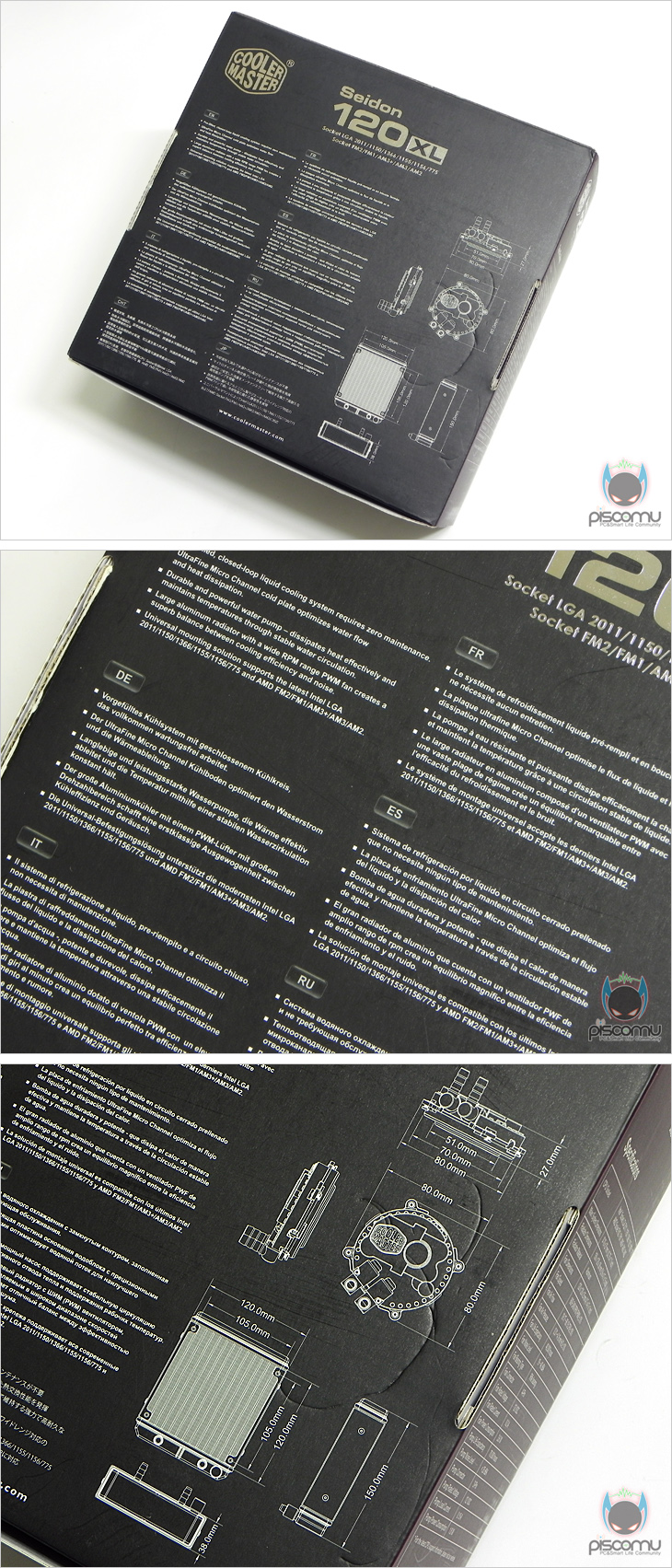 Seidon 120XL의 제품 박스는 앞서 출시한 Seidon 120M과 동일한 색상으로 디자인이 되어있으며, 해당 제품 이미지와 함께 모델명, 제품 특징을을 크게 3가지 언급하고 있겠습니다. 일체형에 따른 유지보수 무료, 오버클럭을 위한 디자인, 초미세 마이크로 채널 베이스 내부 재질을 언급하겠습니다. 이 밖에 소켓 지원여부도 확인할 수 있는데, 예전 프로세서 소켓부터 최신 프로세서의 소켓까지 앞서 Seidon 120M과 동일하게 지원을 해주고 있어, 호환성 폭은 넓겠습니다. 또한, 박스 측면에는 제품의 기본 사양을 표기해놨는데, 앞서 만난 Seidon 120M을 기억한다면, 간접적으로 차이점을 바로 찾을 수 있습니다. 바로, 라디에이터의 두께입니다. 그리고, 나머지 부분들은 Seidon 120M과 동일한 워터블록, 튜브 길이, 팬을 가지고 있겠습니다. 박스 후며에는 각 나라별 언어로 제품 특징을 소개하고 있는데, 아쉽게 한국어는 포함되어 있지 않습니다. 하지만, 제품의 부위별 사이즈를 표기해놔서, 좀 더 제품의 크기를 생각해 자신의 케이스와 호환성이 있는지를 생각할 수 있겠습니다.