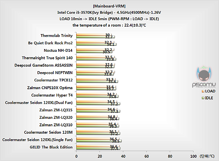 먼저, 프로세서의 냉각 성능을 확인해 보면, 듀얼팬 모드시 최상위 수준의 성능을 보여주는 것을 확인할 수 있겠습니다. IDLE과 LOAD상황 모두에서 최상위 수준으로 보여주고 있어, 만족스럽다 할 수 있겠습니다. 싱글팬일 경우도, 기존 Seidon 120M보다 더 낮은 온도를 보여주면서 역시 상위 수준의 냉각 성능을 보여주는 것을 확인할 수 있겠습니다. 싱글팬 역시 라디에이터의 차이점에 따른 성능을 그대로 보여준다 할 수 있겠습니다. 진행 동안 메인보드 전원부에 주는 쿨링 영향을 확인해보는데, 일반적으로 일체형 수냉 쿨러 경우 대부분 영향을 주지 않습니다. Seidon 120XL 역시 듀얼팬과 싱글팬 상황 모두에서 전원부에 쿨링 영향을 크게 주지 않는 것을 확인할 수 있겠습니다. 하지만, 최근 메인보드 자체적으로 전원부 쿨링 처리가 뛰어나기 때문에, 크게 아쉬운 부분은 아니겠습니다.