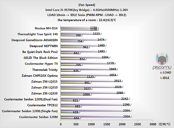 팬 속도 부분은 앞서 언급했듯이 제공되는 팬이 하위 모델인 Seidon 120M과 동일한 팬으로 작동 범위 역시 동일하겠습니다. 실제 작동 속도에선 듀얼팬일 경우 LOAD에선 최대 속도치보다 조금 낮은 속도로 작동을 했으며, IDLE은 최소 속도치와 근접하게 작동을 했습니다. 이와 달리, 싱글팬은 LOAD와 IDLE에서 모두 각각 최대치와 최소치에 근접하는 속도로 작동을 했습니다.