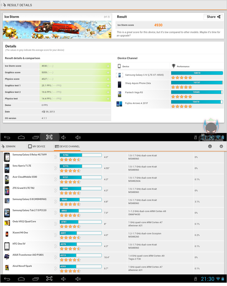 그럼, QM101의 그래픽 성능은 어떨까? 앞서 시작에서 잠깐 언급했듯, QM101는 디스플레이에 강조를 한 제품이라 볼 수 있는데, 이와 함께 그래픽 성능 역시 함께 강조가 된 제품이라 할 수 있습니다. 왜냐하면, 탑재된 GPU가 옥타 코어 다시 말해, 8코어 그래픽 프로세서이기 때문입니다. 실제, 벤치마크를 통해 성능도 확인을 해보았는데, 가장 최근에 출시된 이미 PC 그래픽카드 벤치마크 프로그램으로 잘 알려진 3DMark의 제작사 Futuremark사의 안드로이드 기반 3DMark를 실행해 본 결과, 4930점으로 동일한 쿼드코어 CPU의 대기업 브랜드의 스마트폰이나 타블렛PC보다 앞서는 결과를 보여줬습니다. 앞서 만난 자사의 MD7과는 2배이상 차이를 보이는 결과값이기도 하기에 그래픽 성능이 상당히 뛰어나다 할 수 있겠습니다. 추가로 흔히 스마트폰/타블렛PC 전체 성능 벤치마크로 많이 사용되는 AnTuTu벤치마크를 통해서도 실행한 결과, QM101보다 비싼 제품들보다 더 나은 성능 결과를 보여주기도 해서, 쿼드코어의 CPU와 옥타(8) 코어의 GPU를 통한 전체적인 성능도 QM101이 30만원초반대라는 가격을 생각했을 때, 상당히 높은 만족도의 성능을 보여준다 할 수 있겠습니다. 끝으로, QM101의 배터리의 사용량을 체크해보았습니다. QM101의 총 배터리량은 6000mAh 고가의 경쟁 타블렛PC와도 비슷한 용량을 가진 것입니다. 실제, 소모량이 많은 게임이나 고화질 동영상을 각각 1시간, 2시간정도 사용해도 여유가 많이 남는 것을 확인할 수 있어, 대용량에 속하는 배터리량이라 할 수 있겠습니다.