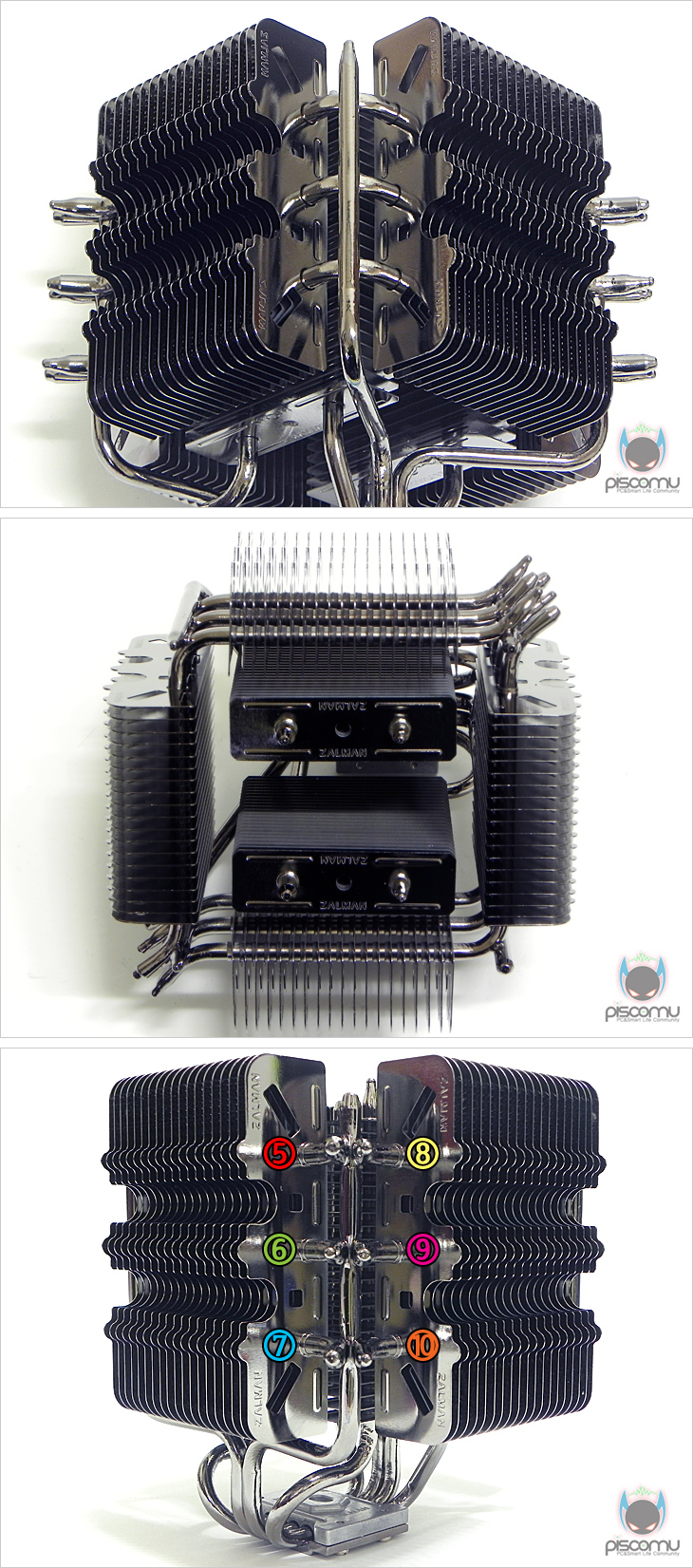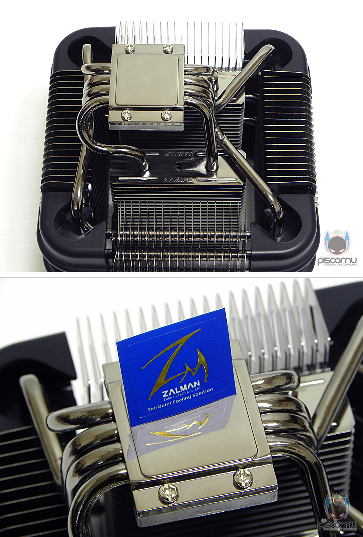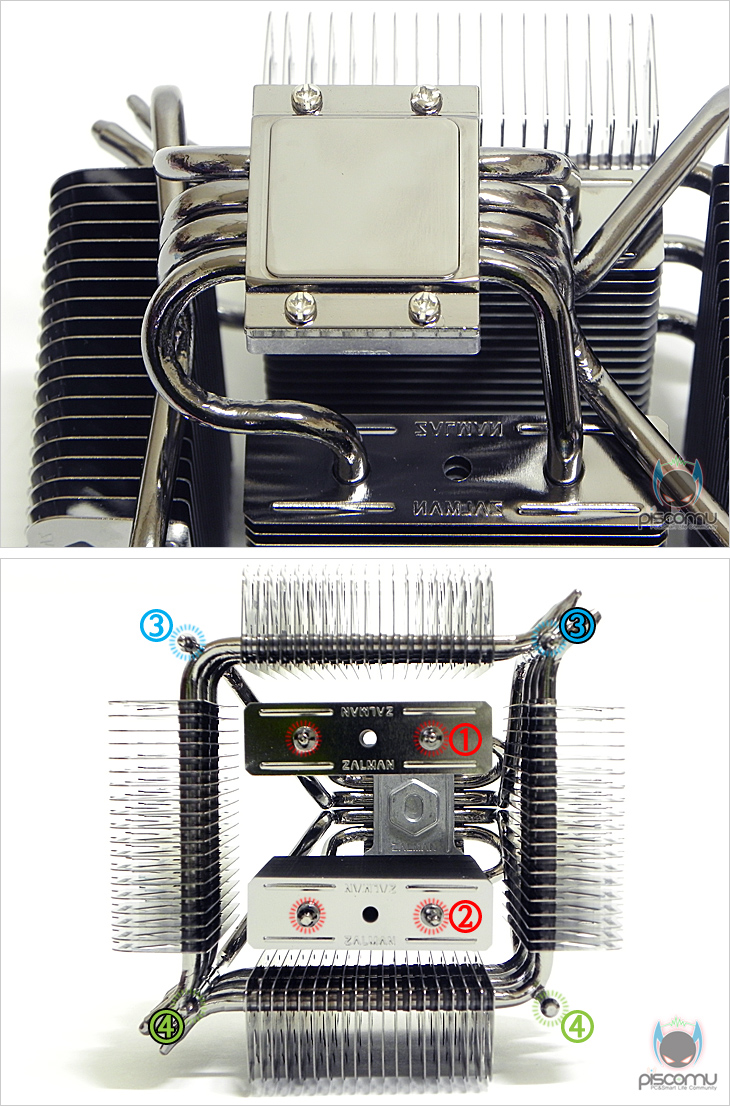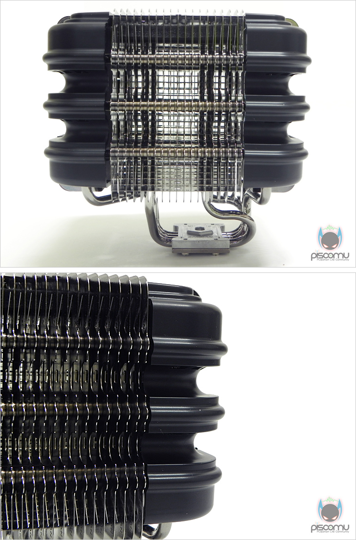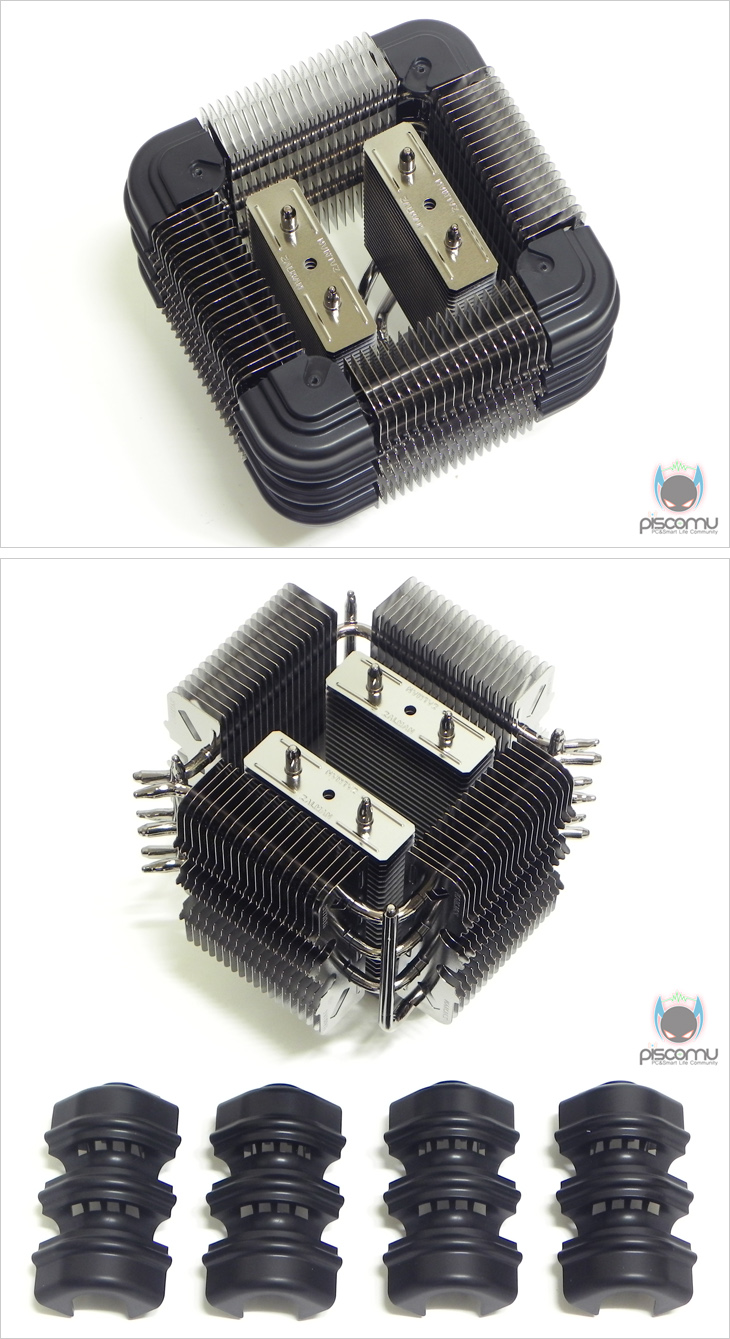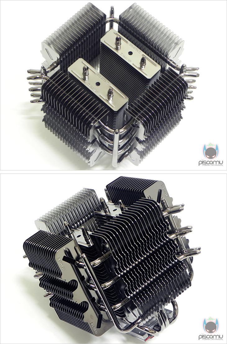 이렇게 모서리 커버까지 분리하면 전체적인 쿨러 구조를 확인할 수 있는데, 일단 히트파이프와 방열핀은 모두 잘만 특유의 흑진주 니켈 도금처리가 이번에도 적용되어 고급스러운 느낌을 줍니다. 그리고, 얼핏 봐서는 복잡한 구조인 것 같지만, 생각보단 단순한 구조입니다. 방열핀은 정사각형 안 내부에 각각 2구역으로 나뉘어져 있고, 정사각형 부분엔 각각 4구역으로 방열핀이 나뉘어져 있겠습니다. 그리고, 이 방열핀 구역을 히트파이프가 통과하는 구조가 되겠습니다. 그리고, 이를 통과하는 히트파이프는 총 10개로 여기서 말하는 10개는 일반적인 타워형 쿨러의 U자형 구조상 가져오는 효과 개수가 아니라 실제 개수 10개가 되겠습니다. 먼저, 베이스를 통과해서 올라가는 일반 구조의 히트파이프가 총 4개입니다. 정사각형 4구역의 방열핀을 통과하는 히트파이프가 ㄱ, ㄴ 형태로 각각 3개씩 총 6개가 적용되는 것을 확인할 수 있습니다. 그래서, 총 히트파이프의 개수는 10개가 되겠습니다. 기존의 쿨러 방식이라면 기본적으로 히트파이프는 CPU의 열을 받는 베이스를 통해 올라오는 형태인데, FX100은 이런 기본 구조 외에 독립적으로 분리된 총 6개의 히트파이프가 방열핀을 통과하고 있어, 과연 성능에 어떤 결과를 가져올지 기대를 해봅니다.