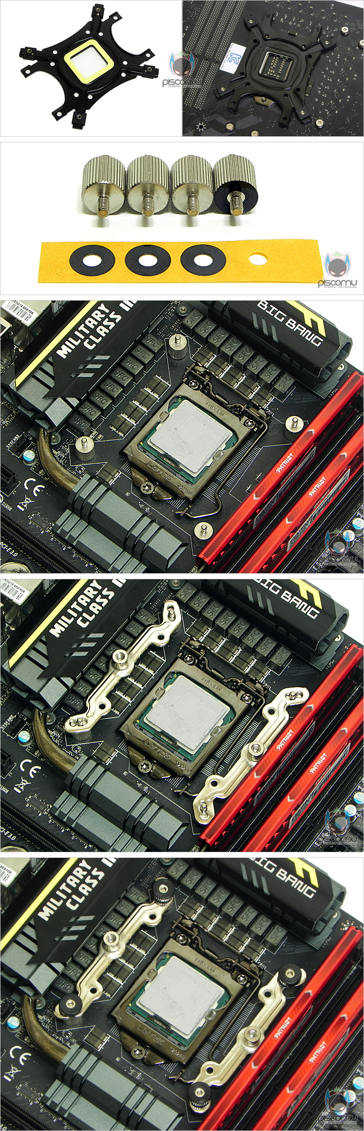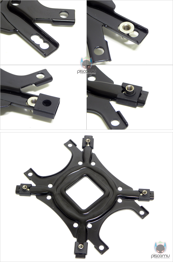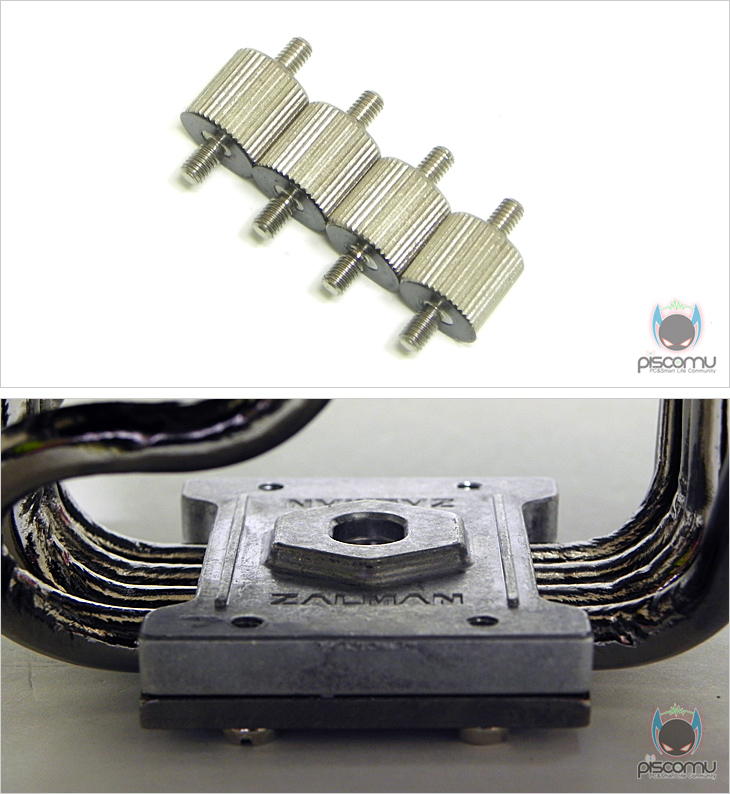 이제, 직접 FX100을 사용해 보겠습니다. 먼저, 장착은 기존의 잘만 쿨러 제품과 큰 차이가 없어, 한 번 잘만 쿨러를 사용해 본 사용자라면, 어렵지 않게 장착할 수 있습니다. 일단, 백플레이트에 자신이 사용하는 프로세서(CPU)에 맞춰 소켓 셋팅을 해줍니다. 먼저, 너트를 끼우고, 그 다음 슬라이드캡으로 고정을 하는 셋팅이 되겠습니다. 그 다음, 양면테이프를 백플레이트에 부착합니다. 나머지 한 면은 떼어내도 되고, 안 떼어내도 되겠습니다. 그 다음 메인보드 후면에서 메인보드 소켓에 맞춘 후, 니플A에 인텔용 와셔를 부착해서 메인보드와 백플레이트를 결합해줍니다. 그 다음, 프로세서(CPU)에 써멀컴파운드를 도포한 후, 클립 지지대를 올리고, 고정너트로 결합해줍니다.