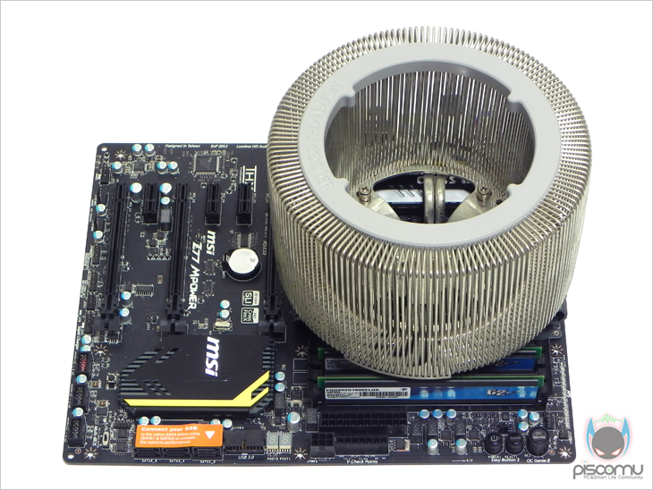 끝으로, 장력에 아쉬움을 빼면, 사실상 FX100은 현재의 팬리스 중 가장 완성도가 있는 모델이라 할 수 있습니다. 그 동안 팬리스 모델은 둘 중 하나를 선택해야하는 입장이였습니다. 팬을 옵션으로 장착해야하는 형태와 팬 없이 순수 팬리스 효과를 위한 쿨러인데, 순수 팬리스 쿨러 경우는 비싼 재표를 사용하지 않는 이상, 면적은 넓히는 방법 밖에 없어, 이럴 경우 메인보드의 1~2번 PCI슬롯과 간섭 발생이 많이 생깁니다. 이런 점에서, 앞서 확인했듯 FX100은 메모리 간섭뿐만 아니라 PCI슬롯과도 해결한 모델이기에 완성도는 높다 볼 수 있겠습니다.