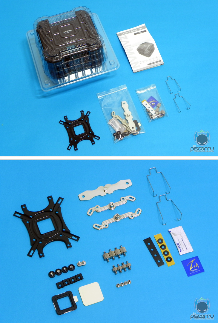 제품 구성은 캡(CAP)형식으로 포장된 본 FX100 쿨러를 비롯해, 설명서, 부속품으로 이루어져 있으며, 부속품에는 백플레이트, 장착 클립, 클립지지대, 팬 클립, 고정 너트, 고정 볼트, 슬라이드 캡, 로딩 블록, 양면 테이프, 니플A, 니플B, 너트, 인텔과 AMD용 각 와셔, 소량의 써멀컴파운드 ZM-STG2M이 제공되겠습니다. 부속품 구성은 그 동안의 잘만 쿨러와 큰 차이가 없겠습니다.