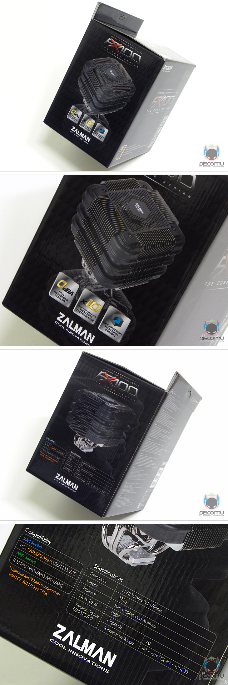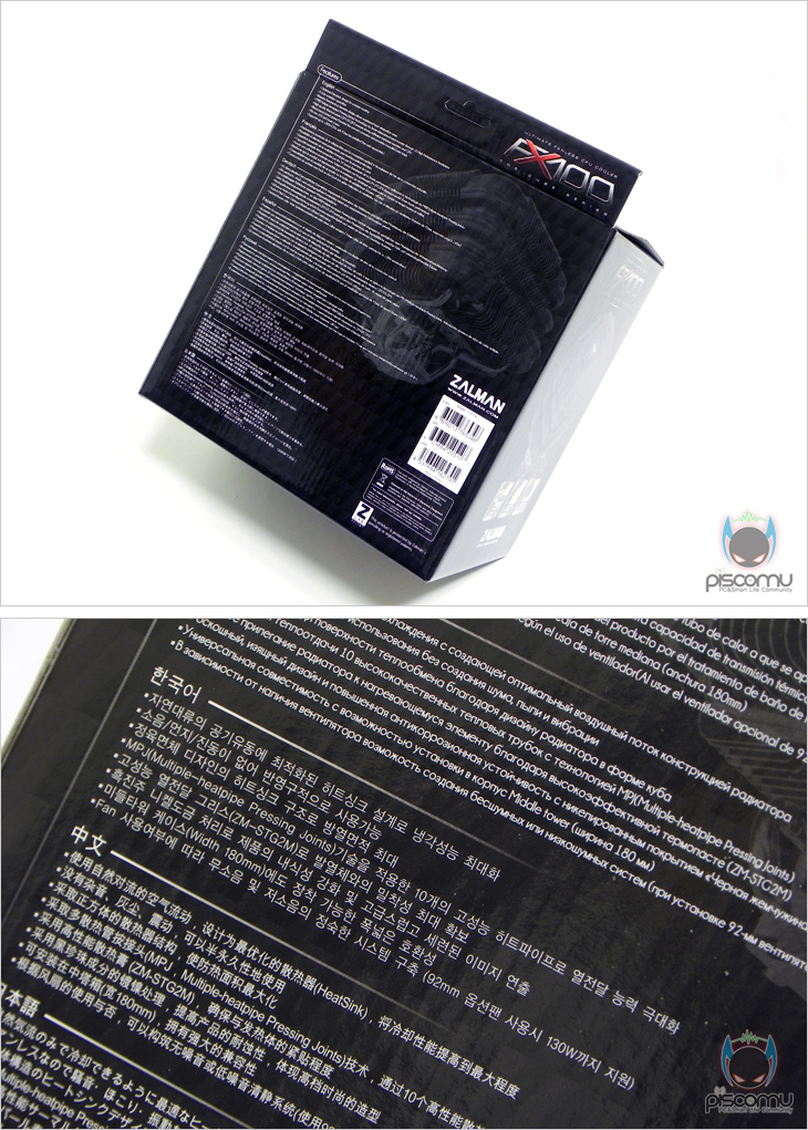 앞에 시작에서 잠깐 얘기했듯, FX100은 출시 전 이미 IT박람회에 참가하는 기사를 통해 주목을 받았고, 혁신 디자인까지 수상했습니다. 그래서, 출시 전부터 소비자들이 주목을 하고 있었습니다. 이는 제품 박스에서도 가장 먼저 확인되는 부분이며, 팬리스(Fanless) 컨셉과 독특한 사각 디자인을 특징으로 언급하고 있겠습니다. 또한, 히프파이프는 총 10개가 적용되었음을 함께 언급해주고 있습니다. 박스 측면을 통해서는 제품 이미지 삽입을 통해 간접적으로 제품 디자인을 확인할 수 있는데, 앞에서 언급한 사각 디자인을 한 눈에 볼 수 있습니다. 그리고, 제품의 스펙 정보를 통해서는 제품의 크기와 무게, 소켓 지원 여부를 확인할 수 있으며, 팬에 대한 정보가 없는 것을 확인할 수 있어, 팬 제공이 없음을 짐작할 수 있겠습니다. 박스 후면에는 각 나라별 언어로 제품을 소개하고 있는데, 국산 브랜드로 한국어는 기본 포함되어 있습니다. 앞서 확인된 특징 외에 잘만 특유의 도금처리, 케이스 호환성, 옵션 팬 사용시 최대 전력 지원을 추가로 확인할 수 있겠습니다.