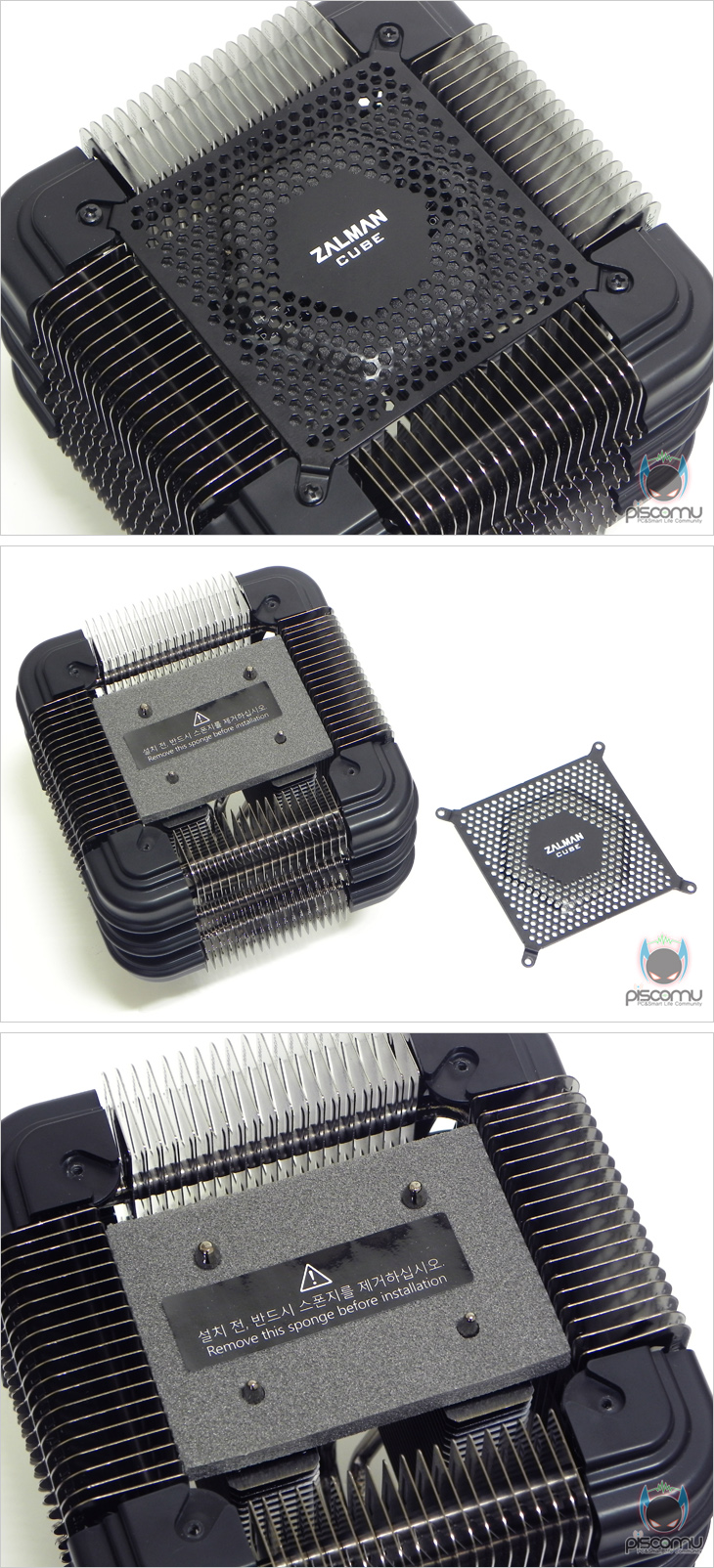 또한, 제일 윗부분 가운데는 벌집 모양의 에어홀 커버가 적용되어 있는데, 이는 외부 먼지가 내부로 유입되는 것을 최소화하기 위한 디자인이라 할 수 있습니다. 그리고, 커버 각 모서리 부분의 나사를 풀면, 분리도 가능하겠습니다. 이렇게, 커버를 분리하면 내부에 초기 상태 시, 스펀지와 함께 설치 전, 제거하라는 문구를 확인할 수 있는데, 이는 옵션으로 팬을 사용하지 않아도, 제거를 해야 하는 부분으로, 이유는 간단합니다. 내부 히트파이프와 방열핀을 통해 올라오는 발열이 빠져나가야 하기 때문입니다. 그리고, 커버를 분리하면 내부에 옵션으로 92mm 팬을 장착할 수 있는데, 장착에 앞서, 외부 정사각형 디자인의 각 모서리 부분인 커버 역시 쿨러에서 분리가 가능하겠습니다. 단순히 끼워져 있는 구조이기 때문에 상위 커버만 분리되면 역시 쉽게 분리를 할 수 있겠습니다. 그리고, 모서리 커버 역시 아랫부분에는 각각 에어홀 처리를 통해 공기유입과 발열 배출이 될 수 있도록 디자인 처리했습니다.