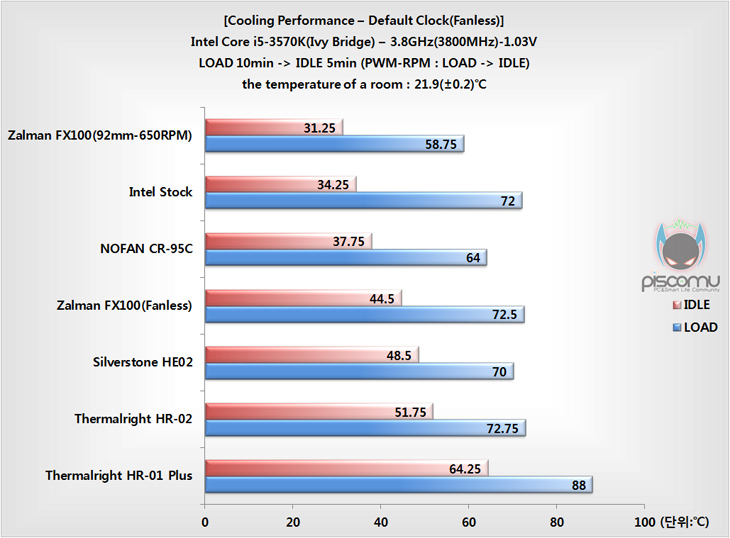 이제, FX100의 냉각 성능을 확인해 보겠습니다. 팬리스 쿨러이기 때문에, 오버클럭이 아닌 일반 클럭으로 진행되는데, 사용된 프로세서(CPU) i5-3570K의 기본 동작 최대 클럭인 3.8GHz에서 진행이 되겠습니다. 전압은 1.03V가 들어갔습니다. 그리고, 인텔 기본 쿨러를 포함해, FX100까지 총 5종의 팬리스 쿨러와 성능을 비교해 보겠습니다. 또한, FX100은 옵션으로 장착되는 92mm 팬 650RPM 사용시 성능도 함께 포함해 진행되겠습니다.