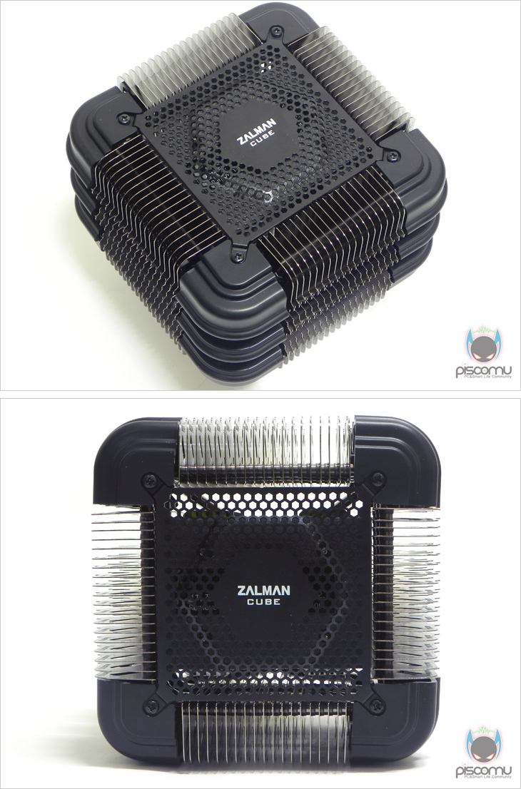 FX100을 살펴보면, 가장 먼저 눈에 들어오는 부분은 역시 디자인 부분으로 그 동안 팬리스 쿨러들이 종종 출시되었지만, 일반적인 타워형이나 원형이였던 반면에, FX100은 정사각형 모양으로 확실히 차별화된 디자인을 보여줍니다. 정사각형의 크기는 가로x세로 길이 156x156mm를 가졌습니다. 특히, 측면에서 보면 더욱 제품의 차별화를 느낄 수 있는데, 정사각형 디자인에 마치 블록이 층층으로 쌓아진 것처럼, 쿨러 구조도 독특하다라는 것을 확인할 수 있습니다.