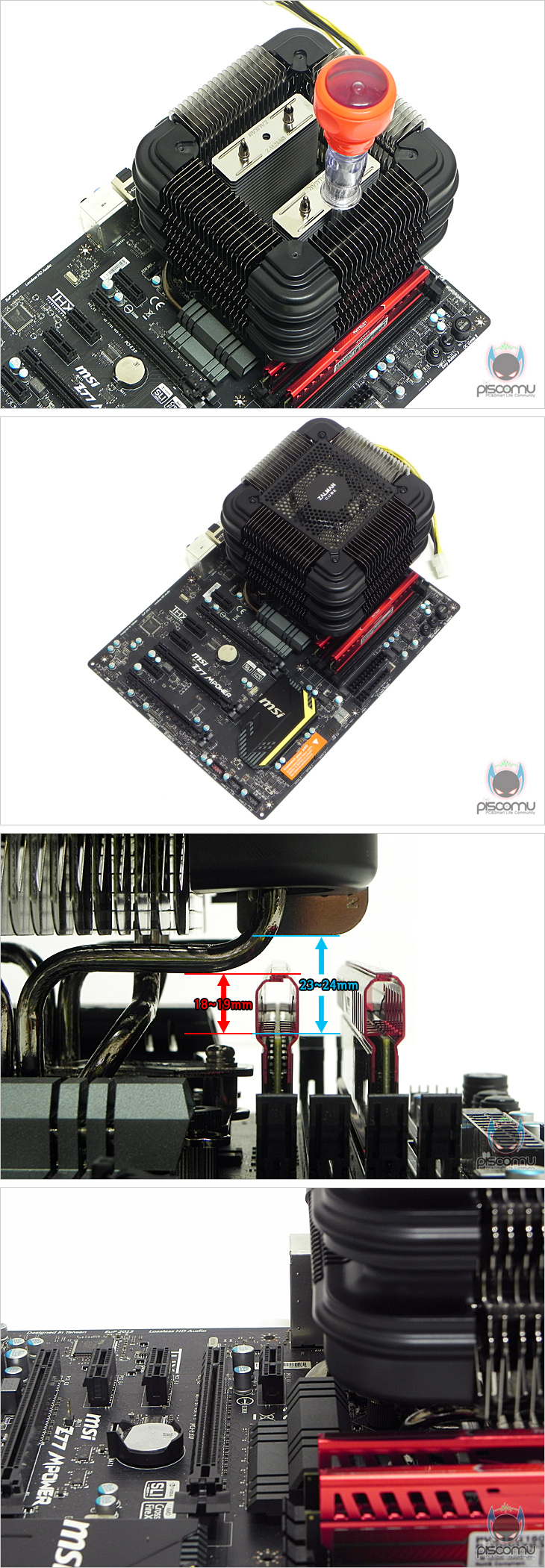 그리고, 최종적으로 쿨러를 올리면서 함께 올린 장착 클립을 드라이버로 고정 볼트와 함께 체결해 결합해주면 되는데, 드라이버를 사용하기 위해서, 쿨러 상위 커버를 분리해야 하겠습니다. 쿨러를 최종적으로 장착한 후, 메인보드의 메모리 간섭 여부를 확인해 본 결과, 방열판이 있는 메모리와도 간섭이 없는 것을 확인할 수 있어, 간섭에 대한 우려는 크지 않다 할 수 있겠습니다. 하지만, 일부 튜닝요소가 있는 방열판 메모리(대표적인 예:커세어 도미네이터)와는 간섭이 발생할 수 있습니다. 참고로 FX100와의 메모리 방열판 높이 지원은 히트파이프 기준에선 약 18~19mm이며, 방열핀 기분에선 약 23~24mm가 되겠습니다. 또한, 일반적으로 팬리스 쿨러는 크기가 일반 쿨러보다 커서 메인보드의 1번 PCI슬롯과 간섭이 자주 발생하는데, FX100는 이런 문제를 깔끔하게 해결해, 일부 메인보드 중 1번 PCI슬롯에 그래픽카드를 장착하는 모델에서도 간섭이 없겠습니다.