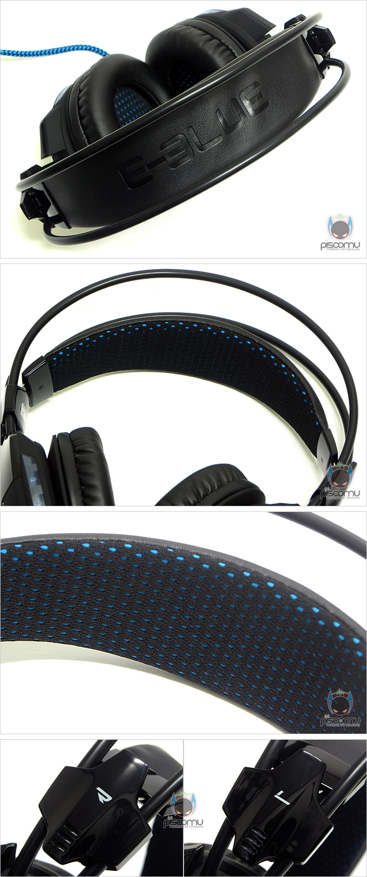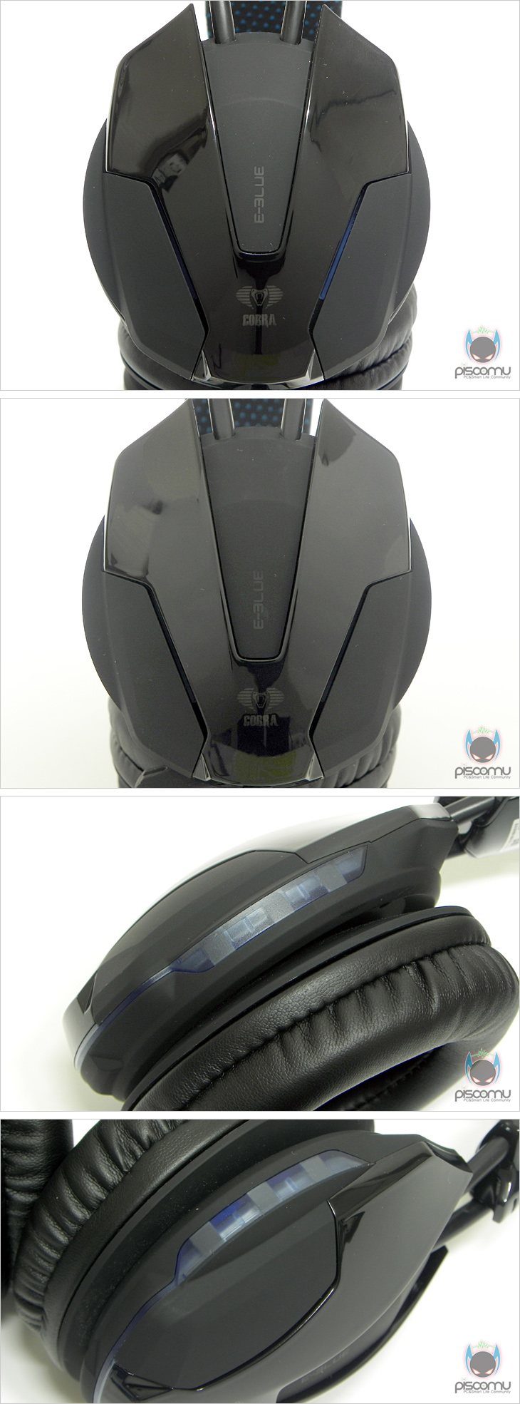 COBRA TYPE-II 705를 살펴보면, 전체적인 외형느낌은 앞서 출시한 MAZER TYPE-X EHS001와 비슷합니다. 헤어 밴드부터 살펴보면, 이번 모델 역시 이전 모델과 마찬가지로 외부쪽은 지지대를 적용했으며, 밴드 부분은 착용했을 시, 자동으로 들어나는 와이어 방식으로 착용했을 때, 좀 더 밀착도가 있겠습니다. 또한, 밴드 바깥쪽은 브랜드명이 새겨져 있으며, 안쪽 마감은 천 재질이 적용되어 있겠습니다. 참고로 이전 모델에선 스웨이드 재질이 적용되었습니다. 좌우 표기부분은 모두 광택처리로 적용되어 있습니다. 이어(EAR)부분은 양쪽 모두 동일한 디자인으로 일부는 광택처리가 적용되었으며, 브랜드명과 로고부분, 그리고 이어 외곽부분에는 각각 작동시 블루 LED효과를 볼 수 있도록 적용했습니다. 그리고, 왼쪽 이어(EAR)에는 마이크가 있는데, 길이 조절을 할 수 있는 형태로 사용하지 않을 시에는 밀어넣어서 깔끔하게 정리할 수 있습니다. 또한, 마이크 길이는 약 9cm이며, 유연성을 지니고 있어, 자유자재로 길이 형태를 변형할 수 있습니다.