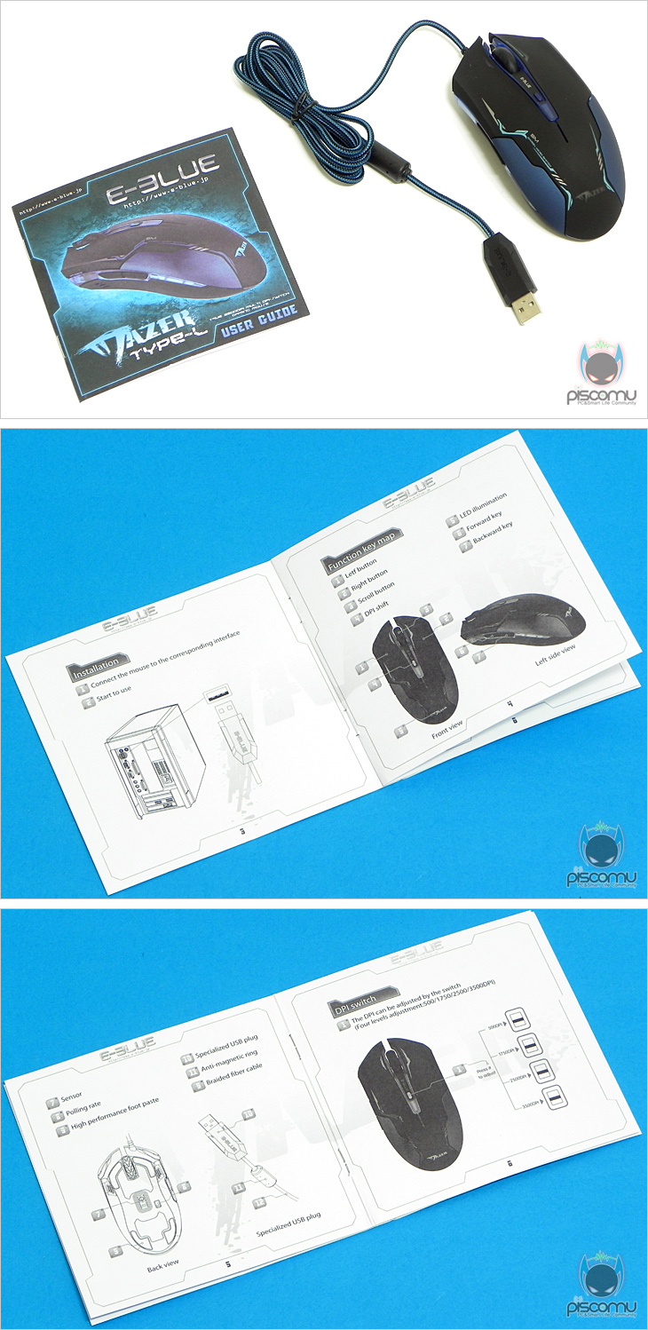 MAZER TYPE-L의 제품 색상은 이전 모델과 다르지만, 형태는 비슷합니다. 역시 전면에 마우스의 디자인 이미지를 삽입해 바로 제품 디자인을 볼 수 있으며, 최대 3200DPI 지원의 게이밍 마우스라는 제품의 컨셉 문구를 비롯해, 모델명, 제품 특징을 확인할 수 있으며, 역시 다른 마우스 제품들과 마찬가지로 전면 커버 도어방식으로 커버를 오픈해 외부에서 내부에 포장된 마우스를 확인할 수 있습니다. 그리고, 운영체제 지원과 연결 인터페이스 방식도 추가로 확인할 수 있겠습니다. 박스 후면에는 부위별로 제품의 특징을 소개하는데, 전송제어 속도(Polling Rate)부터, DPI, 스위치, LED, 측면 버튼, 그립감, 노이즈 필터에 대한 언급을 해줍니다. 그리고, 양쪽에는 각 나라별 언어로 제품 소개와 해당 제품의 기본 스펙 정보를 확인할 수 있겠습니다. 제품 구성은 간단하게 마우스와 설명서로 이루어져 있으며, 설명서에는 사용법, 명칭과 기능 등에 자세한 내용을 담고 있습니다.