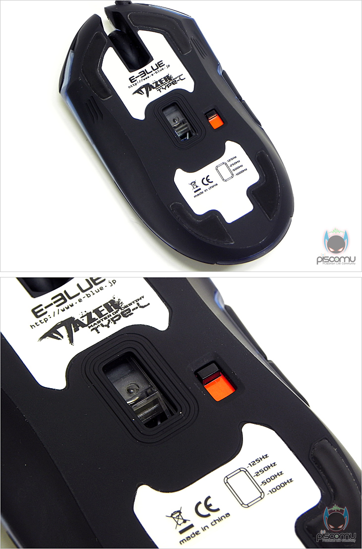 MAZER TYPE-L를 살펴보면, 블랙 위주의 색상을 중심으로 부분 블루 색상을 조화로 이루어진 디자인에 좌우 대칭인 형태를 갖추고 있습니다. 즉, 왼손, 오른손 모두 사용이 가능합니다. 그리고, 이번 MAZER TYPE-R보다는 폭이 좁아, 마우스가 조금 길게 보이는 느낌도 있겠습니다. 기본 좌우버튼을 시작으로 가운데 훨-버튼은 스크롤 정확성을 위해 접지력이 있는 고무 재질을 적용했으며, 휠-버튼 뒤에는 DPI 버튼 배치로 500/1750/2500/3500 DPI순으로 변경되며, LED밝기가 점차 높아지는 것으로 변경값을 확인할 수 있습니다. 그리고, 앞에서 언급한 LED효과를 위해 휠-버튼 주위부분과 마우스 각 측면에는 블루계열의 불투명 재질로 작동시 블루LED 효과를 볼 수 있도록 적용했으며, 우측에는 웹-페이지 앞/뒤 기능을 가진 추가 버튼을 배치했습니다. 마우스 밑면을 통해서는 부드러운 움직임과 슬라이딩을 위해 전후 위치에 테프론 피트를 기본 부착해놨으며, 가운데는 광센서 위치로 센서 오른쪽에는 전송제어 속도값을 변경할 수 있는 스위치가 배치되어 있겠습니다. 속도는 125/250/500/1000Hz으로 총 4단계로 변경할 수 있습니다. 케이블 길이는 총 1.8m를 가졌으며, 케이블 전체는 슬리빙 처리가 적용되어 깔끔하겠습니다. 앞서 전송제어 속도 지원을 통해 연결 인터페이스 방식은 USB방식임을 짐작할 수 있었으며, 신호손실 최소화를 위해 노이즈 필터가 적용된 것도 확인할 수 있습니다. 마우스의 무게는 측정결과, 133g으로 스펙상 무게와 비슷합니다. 끝으로, MAZER TYPE-L의 내부를 살펴보면, 상위 커버쪽 내부에는 무게추가 적용되어 있는데, 측정결과 무게는 약 18g이며, 기판부분에는 총 6개의 LED가 배치된 것을 확인할 수 있습니다. 그리고, 기본 좌우 버튼의 스위치는 옴론 스위치, 센서는 아바고(Avago) A5090칩이 적용된 것을 확인할 수 있습니다.