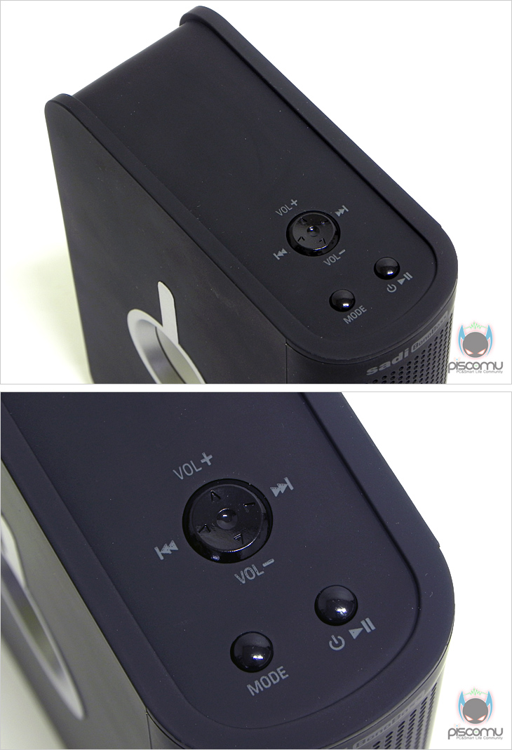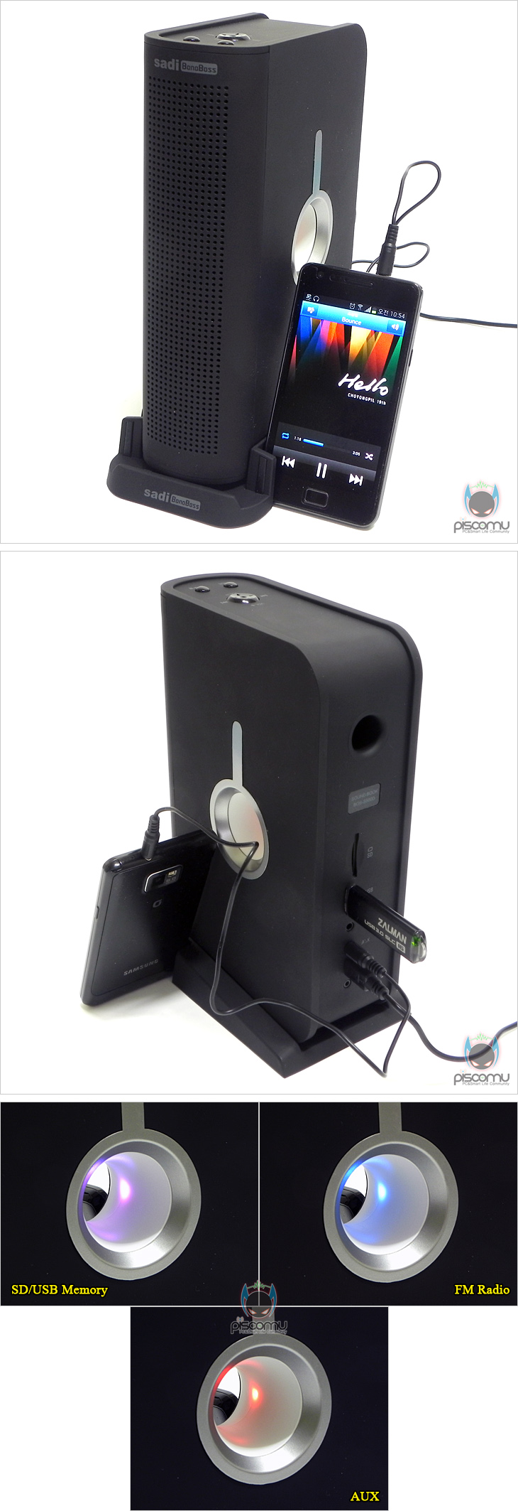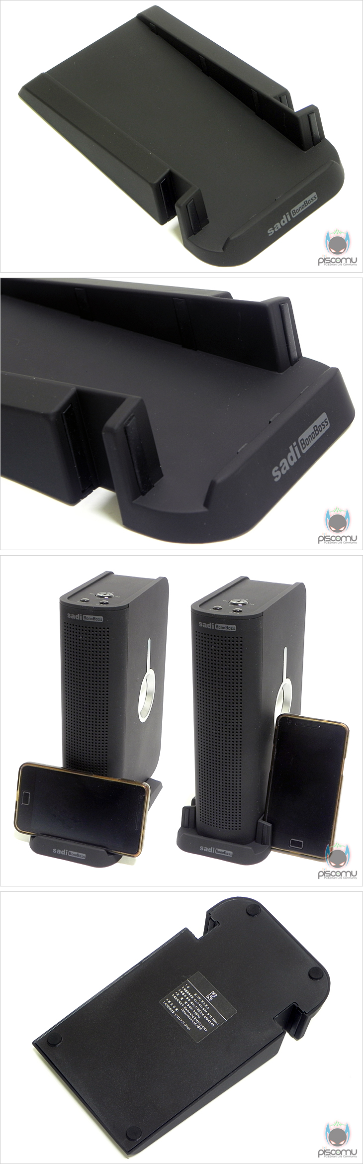 제품 상단에는 앞자리 컨트롤 버튼이 배치되어 있는데, 오른쪽의 전원 버튼은 약 1.5초간 누르면 On/Off 상태를 할 수 있고, SD/USB 메모리를 꽂아 사용할 시에는 재생 및 일시 정지, FM라디오와 AUX 모드일 경우엔 음소거 기능을 할 수 있습니다. 왼쪽의 Mode 버튼을 통해서는 방금 말한 SD/USB 메모리 모드, FM 라디오 모드, AUX 모드 순으로 변경을 해줍니다. 그리고, 위에 볼륨과 이전/다음 건너뛰기의 기본 기능을 가진 버튼은 사운드 재생 외에 FM라디오시 주파수 스캔 기능을 하겠습니다. 그리고, 측면 가운데 있는 큼지막한 원형 홀을 통해서는 홀 안쪽 가운데 있는 LED램프를 통해서 각 모드 상황을 실시간 확인할 수 있는데, SD/USB 메모리 모드일 경우엔 퍼플, FM 라디오 모드는 블루, AUX 모드는 레드 색으로 각각 표기를 해줍니다. 후면에는 제일 위에 덕트를 비롯해, 각각의 포트 지원이 배치되어 있는데, SD메모리카드 슬롯, USB 포트, 헤드폰, AUX(오디오), 전원포트, 안테나 포트 순으로 위에서부터 아래로 배치되어 있습니다. PC스피커외에 다양한 용도로 활용할 수 있게 지원을 했습니다. 이렇게 PC스피커 외에 외부기기 지원도 해주고 있어, 스마트폰이나 타블렛PC를 거치할 수 있는 크래들을 기본 제공해주고 있는데, 스피커와 외부 기기를 거치할 경우 견고한 고정을 위해 내부에는 고무패드를 적용해놨습니다. 그리고, 전면과 측면에 두 곳에 기기를 거치할 수 있습니다. 또한, 크래들 밑면에는 미끄럼방지를 위해 기본 고무 패드를 부착했습니다.
