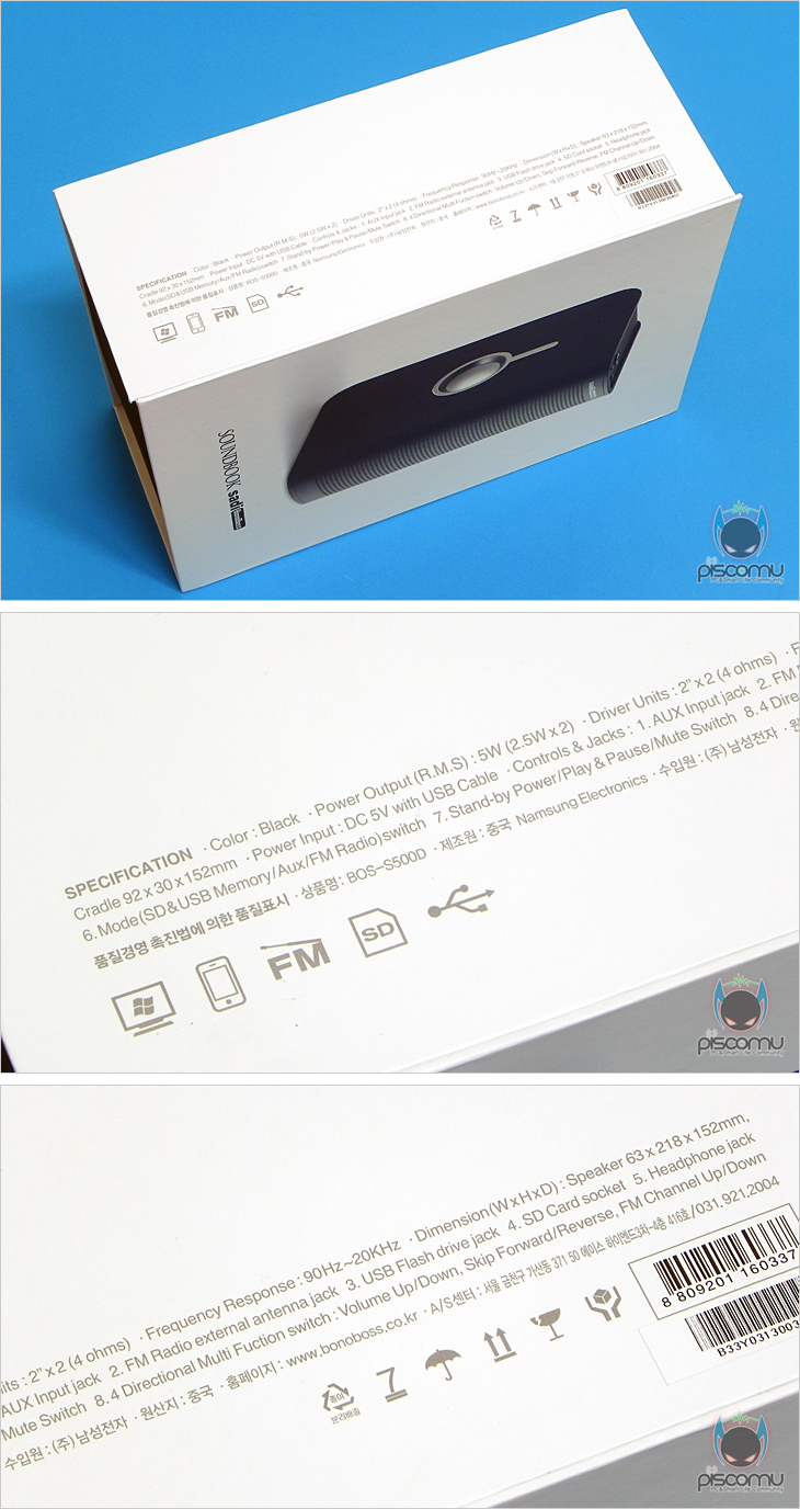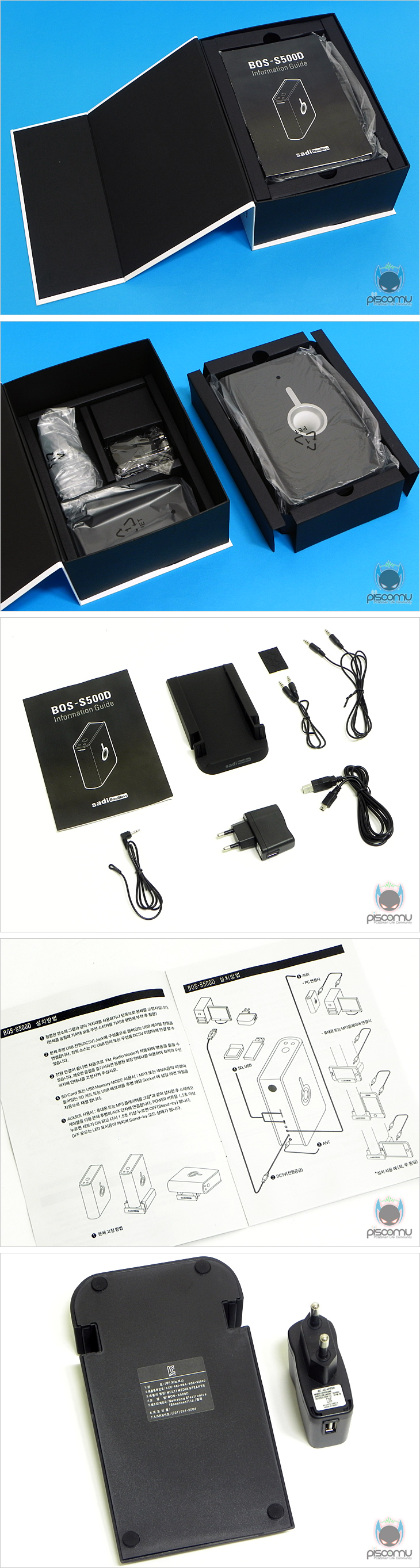 BOS-S500D SoundBook의 제품 팩키지는 제품 박스까지 비닐 동봉된 상태로 되어 있습니다. 스피커 제품으로썬 거의 드문 경우인데, 최근 이런 부피가 크지 않은 제품들은 박스까지 비닐 동봉처리 해 판매제품에 대한 신뢰감을 소비자들에게 주고 있습니다. 제품 박스에는 심플하게 화이트 바탕색에 제품 이미지를 각 면에 삽입했는데, 실제, 제품의 측면과 전면일 때 모습을 담고 있습니다. 그래서, 구입 전 제품 디자인을 쉽게 확인할 수 있으며, 이번 디자인도 독특하다라는 것을 알 수 있습니다. 이 밖에도 모델명과 컨셉 문구도 확인할 수 있습니다. 또한, 제품의 기본 스펙 정보에 표기를 해놨는데, 색상부터 사이즈, 주파수, 출력 등 상세히 표기를 해놔서 구입 전 충분한 도움이 됩니다. 그리고, 운영체제, 휴대기기, FM라디오, SD카드, USB 연결 지원도 확인할 수 있어, 단순히 PC스피커용이 아닌 올인원 스피커임을 짐작할 수 있을 겁니다. 제품 포장은 2단식으로 위에는 본 제품인 스피커가 비닐 포장 되어있으며, 아래에는 부속품들이 담겨줘있습니다. 설명서를 비롯한 부속품에는 거치대 역할의 크래들, 크래들 받침 여분 고무 패드, 오디오 케이블 2개, 외부 안테나 케이블, 전원어댑터, USB 전원 케이블로 이루어져 있습니다. 설명서에는 제품 설치법 등 자세히 소개를 하고 있습니다. 크래들, 전원어댑터 부속품도 전기용품안전인증(KC)을 받았습니다.