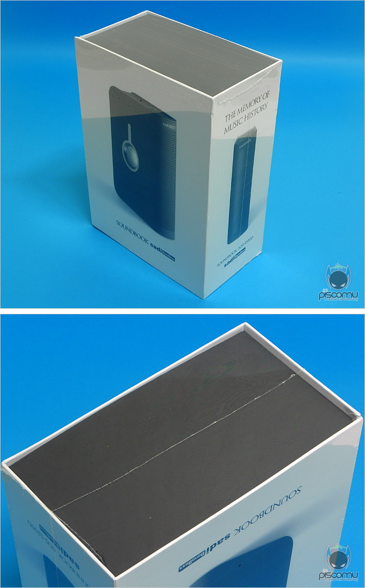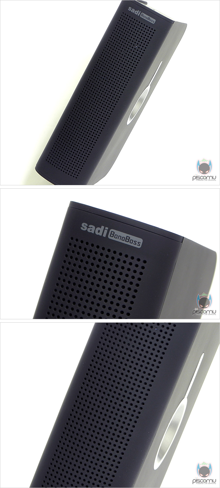 이제, BOS-S500D SoundBook을 살펴보겠습니다. 제품의 전체적인 색상은 블랙이며, 디자인은 모델명처럼 책을 연상케 하는 디자인을 가졌습니다. 이전, BOS-S300D는 그래도 우퍼가 노출되어 있어 스피커라는 인식을 가질 수 있었던 반면, 이번 BOS-S500D SoundBook은 기존의 스피커 디자인 틀을 완전히 벗어난 새로운 디자인의 혁명을 느낄 수 있습니다. 크기는 한 손에 들고 다닐 수 있는 책 크기 정도로, 좀 더 쉽게 언급하면 8인치 타블렛PC 크기 정도가 되겠습니다. 두께는 오히려 책보다 두꺼워서 무게감도 있을 것 같지만, 무게는 1kg의 절반도 안 되는 약 425g를 가지고 있어 가벼운 편입니다. 전면에는 이번 제품에 합작인 디자인부분에 sadi(삼성디자인학교)와 제조사 보노보스 명이 새겨져 있으며, 내부 2개의 드라이버 유닛으로 출력되는 사운드를 외부로 출력되게 에어홀 디자인을 적용했습니다.