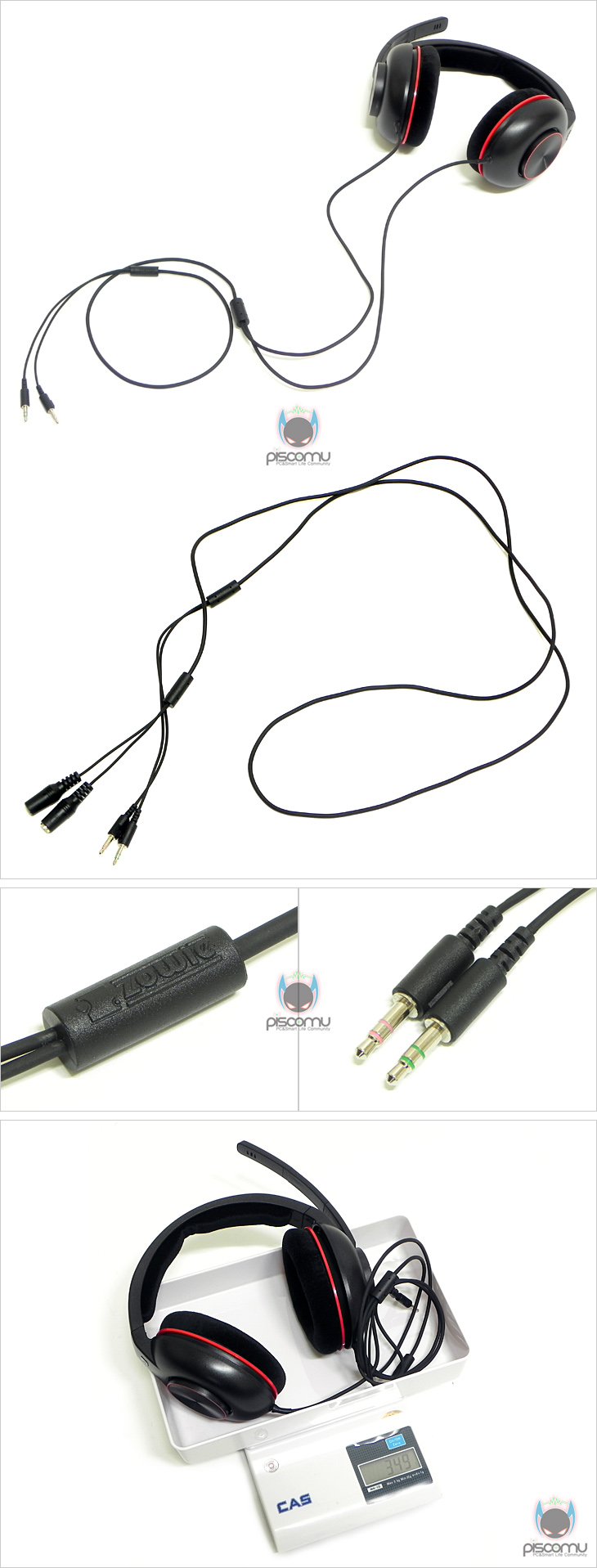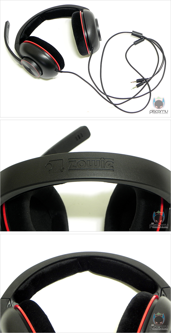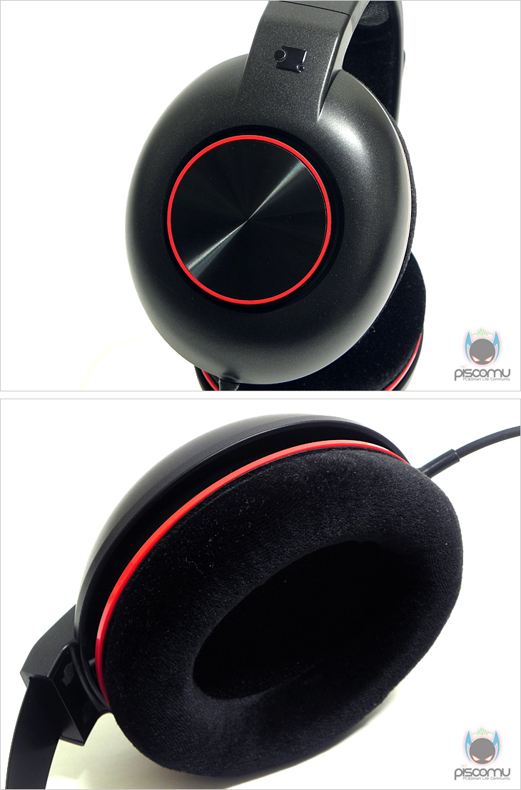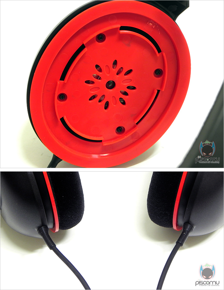 이번엔 이어(EAR)패드 부분을 살펴보는데, 큼지막한 원형 디자인에 외부 블랙 색상 위주에서 가운데 중심부에 레드 원형 라인을 포인트를 주고 있습니다. 착용되는 내부 안쪽에는 역시 스웨이드 재질로 편안한 착용감을 줄 수 있도록 쿠션 처리를 적용했습니다. 쿠션을 포함한 전체 지름은 수평으로 약 9cm, 수직으로 약 11cm로 귀를 전체적으로 감쌀 수 있는 크기입니다. 쿠션 부분은 쉽게 분리가 가능한데, 분리를 통해 내부에 장착된 40mm 드라이버 유닛을 확인할 수 있습니다. 적용된 드라이버 유닛은 네오디뮴 자석을 이용해 높은 볼륨에서도 깨끗한 사운드를 들려주고, 수명 또한 길겠습니다. 현재 대부분의 고가 헤드셋에는 네오디뮴 자석을 사용하고 있습니다. 또한, 이어(EAR)패드 케이블을 살펴보면, 양쪽 드라이버 유닛에 바로 연결되어 각각 분류되어 처리되어 있는데, 최근 한쪽으로 처리되어 나오는 케이블과 차이가 있습니다. 이렇게 이어폰처럼 양쪽으로 처리되면 좌우 들려주는 사운드가 고르다는 장점도 있지만, 이어폰처럼 케이블이 꼬이는 단점도 있습니다. 끝으로, 헤드셋의 기본 케이블 길이는 총 1.2m이며, 제공되는 연장케이블은 1.8m로 총 3m 길이를 지원해주며, 케이블 처리 역시 일반동선케이블과 달리 무산소 동선케이블을 적용해 신호손실을 줄여주겠습니다. 또한, 케이블 마감부분에는 로고가 새겨져 있으며, 극처리는 3극으로 처리가 되어 있습니다. 헤드셋 기본 무게는 약 350g이 되겠습니다.