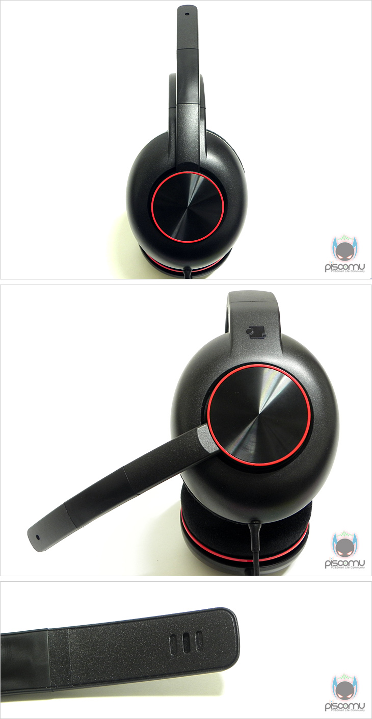 MASHU를 살펴보면, 전체적인 색상은 블랙이며, 헤어밴드 부분 외부 중앙 위치에는 제조사 로고가 새겨져 있습니다. 그리고, 밴드 안쪽 착용부분에는 편안한 착용감을 위해 푹신한 쿠션처리를 적용했습니다. 표면 재질은 스웨이드 재질입니다. 그리고, 사람의 머리 크기에 따라 착용감 조절을 할 수 있게 양쪽 이어(EAR)의 밴드 길이 조절도 지원을 해주는데, 최대 5cm까지 길이를 늘릴 수 있습니다. 그리고, 좌우 구분 표기는 안쪽에 처리가 되어 있습니다. 왼쪽 이어(EAR)패드에는 마이크가 적용되어 있는데, 사용하지 않을 시에는 수직까지 올려 세울 수 있고, 최대 약 120°가량정도 각도조절이 가능해 역시 착용하는 사람에 따라 마이크 각도 조절을 할 수 있습니다. 또한, 마이크는 단일지향성마이크로 주변 잡음을 담지 않아 상대방에서 정확한 음성을 들려주겠습니다.
