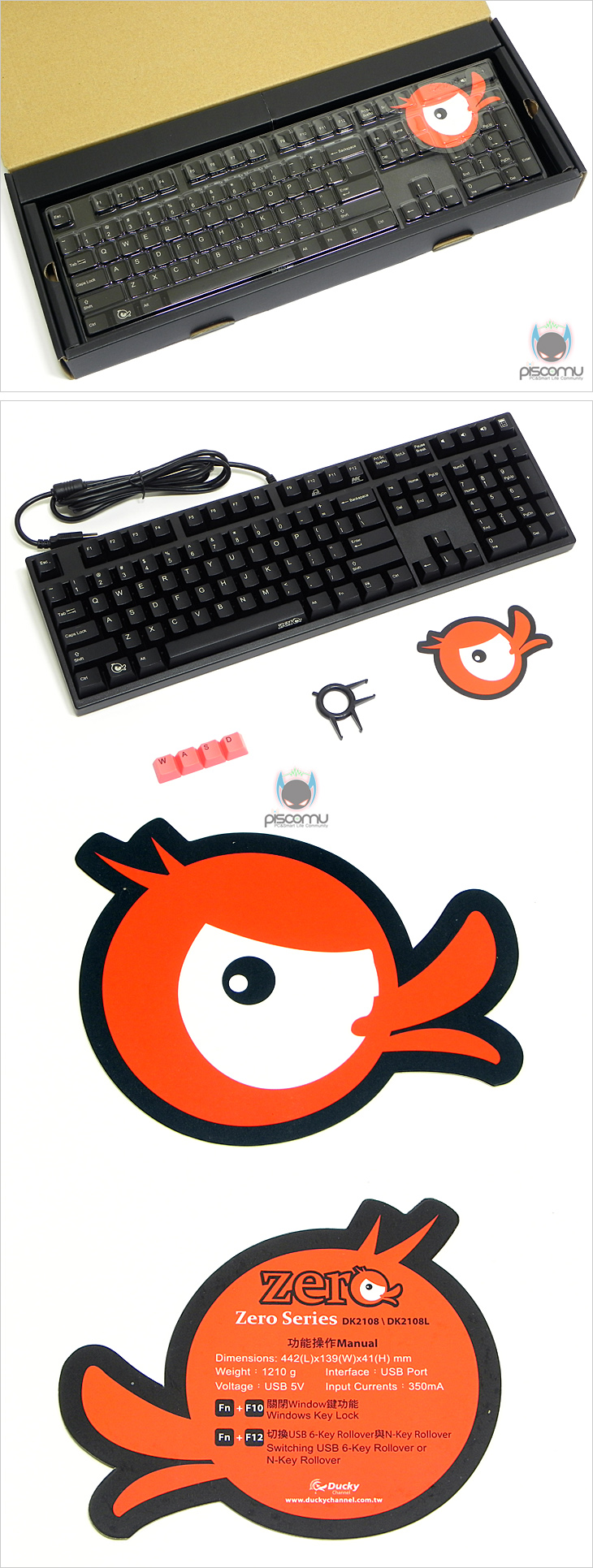 DK2108은 시작에서 말했듯이, Ducky의 새로운 시리즈 라인업 ZERO Series의 모델입니다. 이는 제품 박스에서도 쉽게 확인할 수 있는데, 이전 모델들은 직접 모델명이 표기된 반면, 이번 모델은 시리즈 로고가 새겨져 있습니다. 박스 측면에는 해당 모델의 스위치(Switch) 표기와 무한 동시 키 입력 지원(N-Key Rollover)을 확인할 수 있습니다. 박스 후면에는 제품의 크기(Size), 무게(Weight), 인터페이스(Interface) 표기 확인과 더불어 제품의 특징을 총 6가지 언급하고 있습니다. 윈도우 키 잠금/해제, 볼륨 조절, 체리MX 스위치, 더블 레이어 PCB, 레이저 키캡, 동시 입력 키 지원을 언급합니다. 제품 포장은 키보드 크기에 맞춘 형식에 이물질이 들어가지 않도록 커버를 적용했습니다. 제품 구성은 키보드를 비롯해, 게이밍 모드 WASD 키캡, 키 캡 리무버 도구, 설명서로 이루어져 있습니다. 설명서에는 윈도우 키 잠금/해제(Windos Key Lock/Unlock)와 6키(6-Key) 동시 지원, 무한 키 동시 지원 전환 방법을 소개하고 있습니다.