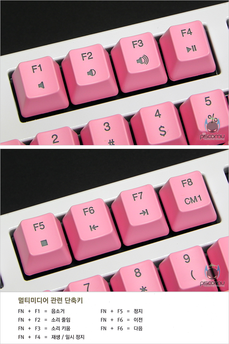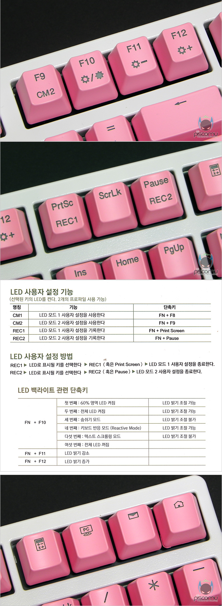 DK9008 Shine2 Pink를 살펴보겠습니다. 기본적으로 현재의 키보드 색상들은 거의 모두 블랙위주인데, DK9008 Shine2 Pink는 특별하게 케이스부분은 화이트, 키캡은 핑크색을 가졌습니다. 이쁘면서 여성들에게 잘 어울리는 모델이라 생각됩니다. 키 배열은 풀 배열을 갖추고 있습니다. 키캡은 ABS수지를 이용했으며, 더블 레이어에 레이저로 각인처리를 했습니다. 물론, PBT 키캡도 별도로 판매를 합니다. 스위치는 독일 체리사 MX 갈축을 적용했으며, LED는 화이트 LED로 적용을 했습니다. 또한, 키캡 손상이 되지 않게 와이어형태의 리무버 도구로 분리할 수 있습니다. 키 특징을 살펴보면, 윈도우 키는 윈도우 로고가 아닌 제조사인 로고로 적용이 되어 있습니다. 그리고, 오른쪽 윈도우 키 오른쪽에는 곧 살펴볼 부가 기능 키들의 기능을 할 수 있게 Fn(펑션)키가 배치되어 있습니다. Fn키 조합으로 부가 기능을 해주는 키들은 먼저 F1키부터 F3키까지는 음소거와 볼륨 조절, F4키부터 F7키 까지는 재생 기능을 가지고 있는데, 설명서 자세히 설명해주고 있어 참고하면 초보자도 쉽게 이해하고 사용할 수 있습니다. 그리고, 사용자가 직접 커스텀으로 LED 설정을 할 수 있는데, F8키와 F9키 2개 각각 1모드씩 저장이 되겠습니다. 그리고, 이런 커스텀 저장을 위해서는 기록을 해야하는데 기록을 해주는 키는 Print Screen키와 Pause키가 되겠습니다. 그리고, F10키부터 F12키까지는 LED 모드와 밝기 조절 기능이며, 이 외에 독립적인 부가 기능 키로는 계산기, 내컴퓨터, 문서, 홈 키로 숫자키 패드 위에 배치되어 있습니다. 화이트색으로 도색처리된 케이스는 컬핏 공법(Water transfer printing)으로 광택도 살리면서 잘 벗겨지지 않도록 했습니다. 끝으로, 키보드 밑면을 살펴보면, 앞 부분에는 USB 전원 케이블과 연결되는 포트 부분으로 케이블 좌우, 가운데 정리할 수 있는 홈 처리가 되었습니다. 사용자 환경에 따라 케이블을 정리 고정하면 되겠습니다.