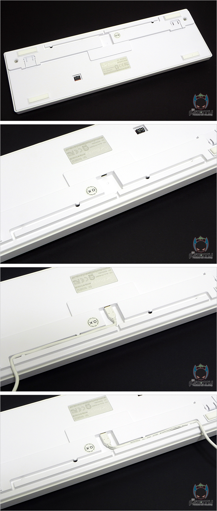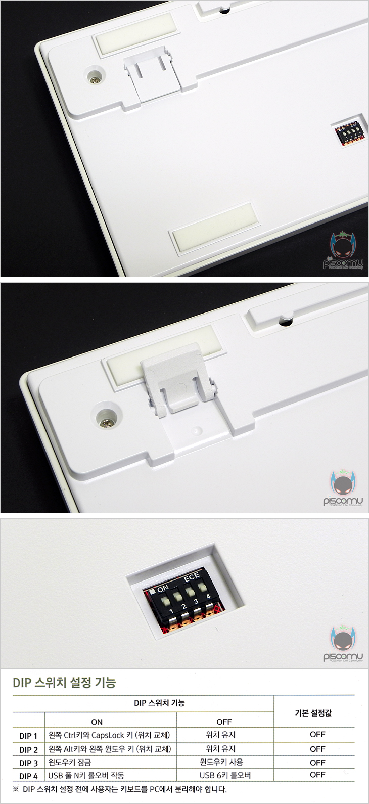 그리고, 미끄럼방지를 위해 각 모서리 부근에는 고무패드를 기본 부착했으며, 양쪽 앞부분에는 높낮이 받침대가 적용되어 있습니다. 그리고, 중앙 약간 왼쪽쯤에는 하드웨어적으로 윈도우 키 잠금/해제, 동시 입력 지원을 셋팅할 수 있는 스위치가 배치되어 있는데, 설명서를 참고하면 쉽게 설정할 수 있습니다. 단, 키보드는 PC에서 분리한 상태에서 설정을 해야합니다.