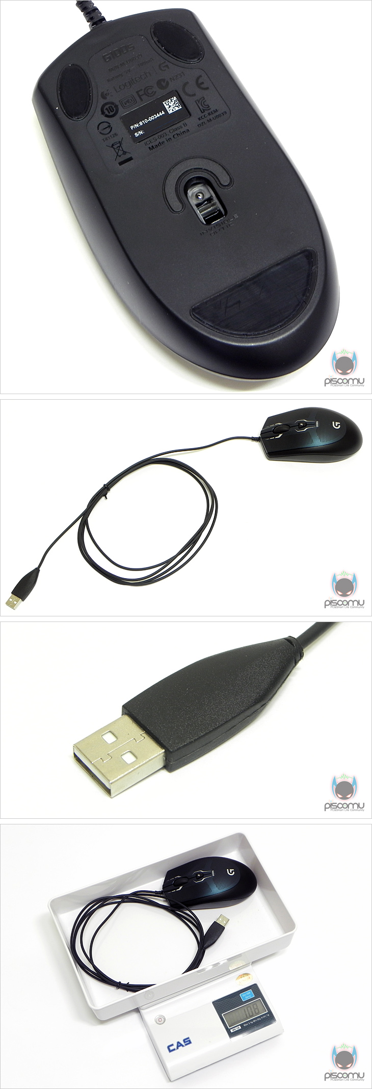 이제, G100S을 살펴보겠습니다. 전체적인 생김새는 기존의 G100과 비슷하며, 색상부분의 차이를 가장 쉽게 확인할 수 있습니다. 또한, 좌우 대칭으로 역시 기존과 마찬가지로 왼손/오른손 양손잡이를 지원해줍니다. 기본 좌우 버튼을 비롯해 가운데 휠-버튼은 접지력을 위해 러버 재질을 적용했으며, 휠-버튼 뒤에는 DPI버튼이 배치되어 있습니다. DPI 스위치는 250~2500DPI까지 지원해주는 값을 3단계로 전환해줍니다. 그리고, 휠 버튼 양쪽이 문양은 마치 스파이더맨 문양을 연상케 합니다. 네이비 색상의 커버부분은 약간의 광택 효과가 있으며, 그 외 나머지 측면까지의 코팅은 무광으로 처리가 되었습니다. 마우스 밑면에는 부드러운 움직임을 위해 앞뒤 자리에 각각 테프론 피트를 기본 부착했으며, 가운데는 광센서를 제조사에선 델타 제로 센서라 언급하고 있습니다. 마우스 케이블 길이는 총 약 2m로 유선으로 넉넉한 길이를 갖추었습니다. 그리고 연결 인터페이스는 USB 방식으로 전송제어 속도(Polling Rate)는 125Hz와 500Hz를 지원합니다. 마우스 전체 무게는 약 108g이 되겠습니다. 끝으로, G100S의 내부를 살펴보면, 상단 커버 안쪽에는 무게추가 적용되어 있는데, 측정결과 약 13g을 가졌습니다. 마우스 좌우버튼은 기존과 마찬가지로 옴론 스위치(D2FC-F-7N)를 적용했으며, 휠버튼과 DPI스위치 버튼은 Kaith 스위치를 적용했습니다. 그리고, 자사에서 언급한 델타 제로 센서는 정확히 센서 출처를 알 수 없지만, 해외에선 AM010 N1302T칩을 Avago사 칩으로 언급하고 있습니다. 짐작하건대, 기존의 G100이 Avago사 A3055칩을 사용했던 점을 생각했을 때, Avago사에 G100S에 적용된 특정 칩을 의뢰할 것으로 판단됩니다.
