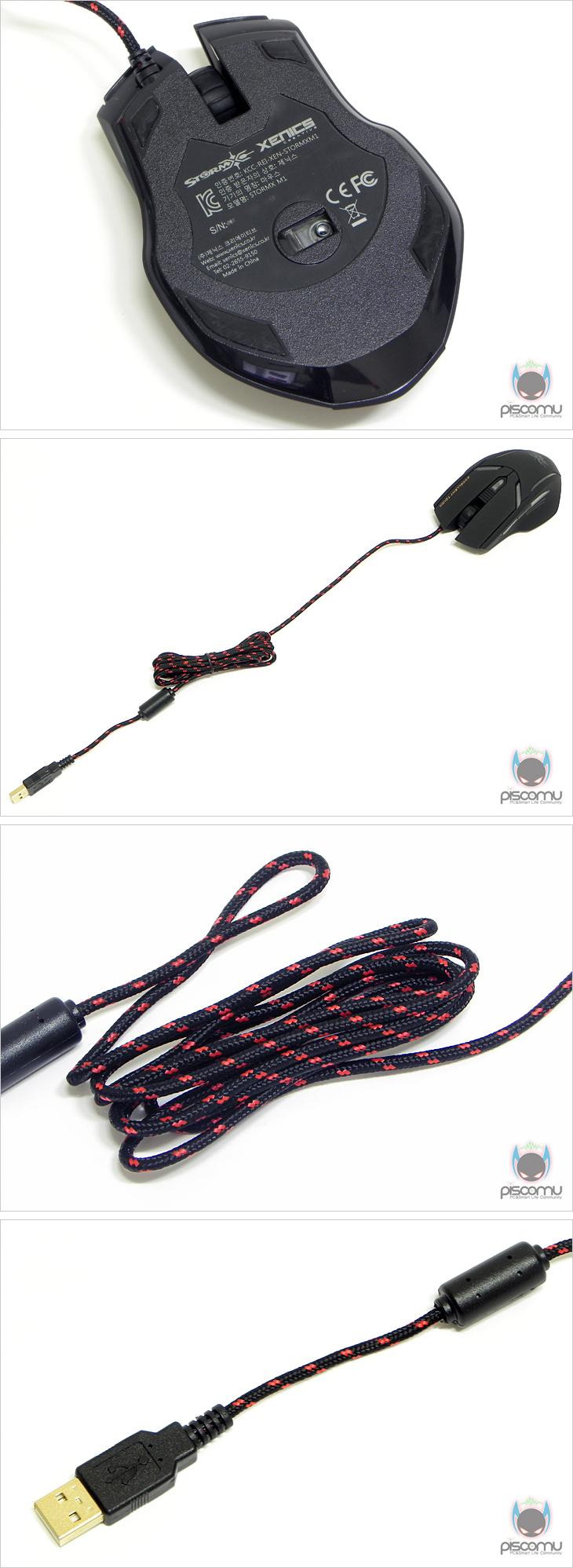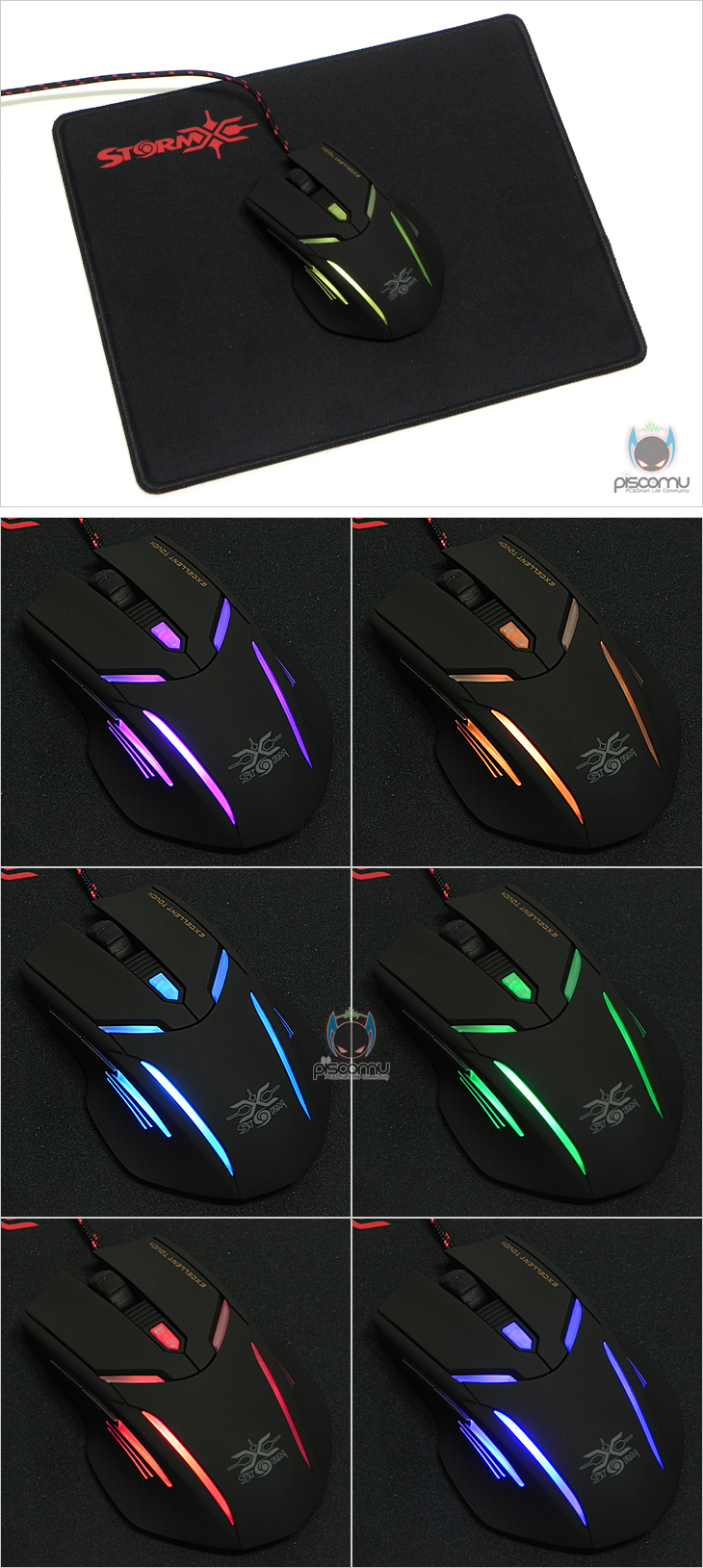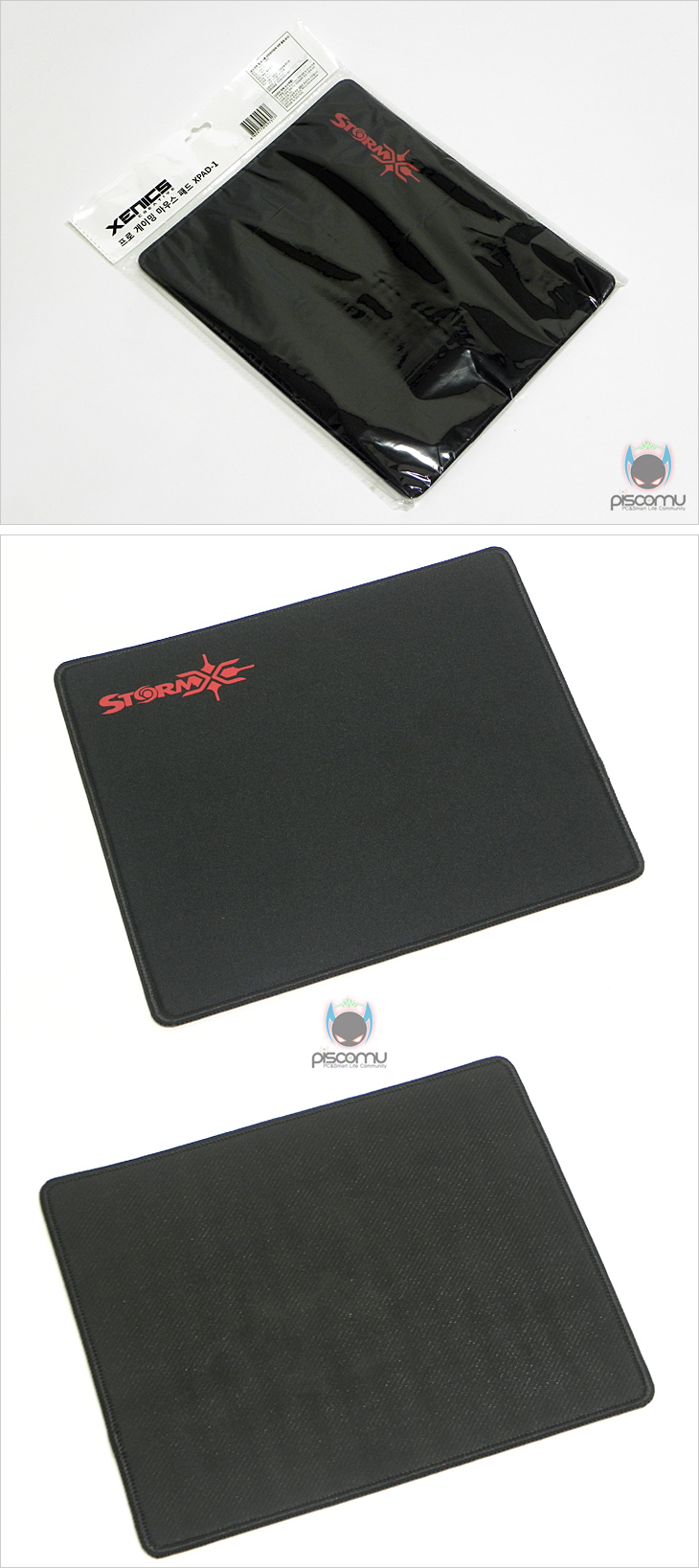 STORMX M1을 살펴보면, 상위 모델 STORMX M3의 하위 모델이자 동일 라인업이라 디자인부분에서 많이 닮은 모습을 가졌습니다. 하지만, STORMX M3는 상위 커버 일부가 메탈느낌의 ABS수지를 이용한 반면, 이번 STORMX M1는 전체 러버 코팅으로 처리가 되었습니다. 하지만, 여전히 아이언맨을 연상케 해줍니다. 그리고, 얼핏 봐서는 좌우대칭을 가진 것으로 보여지 지만, 비대칭으로 오른손 잡이용 마우스가 되겠습니다. 양쪽 기본 버튼을 비롯해 가운데 휠-버튼은 러버 재질과 함께 톱니 모양을 갖춰 접지력과 더불어 스크롤 정확성을 올렸으며, 휠-버튼 바로 뒤에는 DPI 스위치 버튼으로 800/1200/2000DPI 3단계 순으로 전환이 되겠습니다. 그리고, STORMX M3와 마찬가지로 LED효과를 볼 수 있게 처리를 했는데, 상위 커버와 측면 커버에 각각 적용이 되어 총 6가지 컬러로 자동 변경되는 효과를 지원해줍니다. 그리고, 좌측에는 앞/뒤 기능 버튼이 배치되어 있습니다. 마우스 밑면에는 부드럽고 빠른 원활한 움직임을 위해 테프론 피트를 기본 부착했으며, 가운데는 광센서 부분으로 내부에는 PIXART 3509 센서가 적용되어 있겠습니다. 케이블 길이는 약 1.7m로 넉넉한 길이를 가졌으며, 케이블 전체는 패브릭 슬리빙으로 깔끔하게 처리했습니다. 또한, USB 인터페이스에는 금도금 적용과 케이블 끝부분에 노이즈 필터를 적용해 신호손실이 최소화되도록 했습니다. 그리고, 이와 함께 STORMX 네임을 가진 XPAD-1 마우스 패드를 살펴보면, 패드 왼쪽 상위에 동일 네임을 쉽게 확인할 수 있으며, 크기는 약 268x218mm를 가졌습니다. 마우스와 맞닿는 접촉면은 빠른 움직임을 위해 패브릭 재질이 적용되었으며, 장시간 사용으로 내부 러버 재질과 떨어지지 않게 테두리 부분은 스티치 프레임 처리를 했으며, 밑면에는 바닥과 마찰력을 높여 움직이지 않도록 홈패턴 처리를 했습니다.