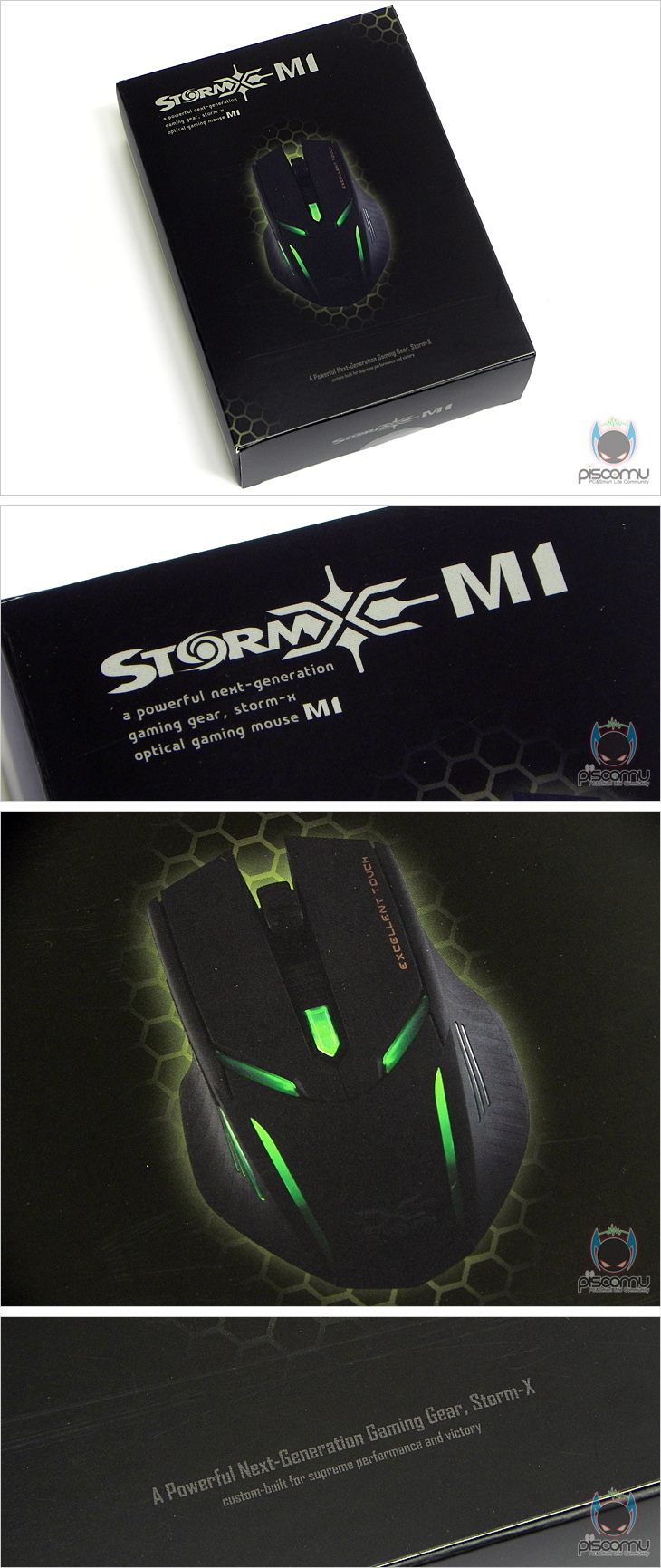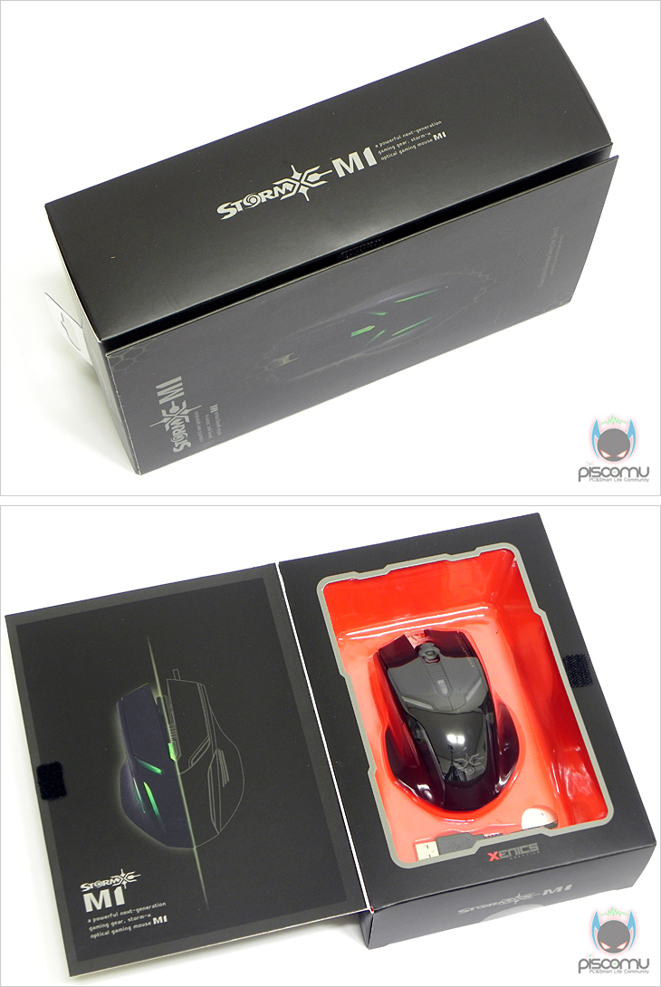 STORMX M1은 상위 모델인 STORMX M3와 디자인부분에서 많이 닮은 것을 모델명과 컨셉와 함께 제품 박스를 통해 쉽게 확인할 수 있습니다. 또한, 다른 게이밍 마우스와 마찬가지로 전면 커버는 오픈이 되는데 내부에 포장된 STORMX M1을 외부에서 간접적으로 확인할 수 있습니다. 박스 후면에는 마우스 버튼별로 기능을 소개하고 있는데, 총 6버튼을 가진 것을 알 수 있습니다. 이 밖에 제품의 특징으로 LED 적용과 내부 무게추 적용을 언급하고 있습니다. 제품 기본 스펙 정보도 확인할 수 있습니다. 제품 포장은 제품 크기에 맞춘 캡(CAP) 방식으로 되어 있으며, 제품 구성은 마우스와 설명서로 이루어져 있습니다.