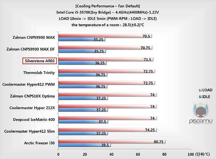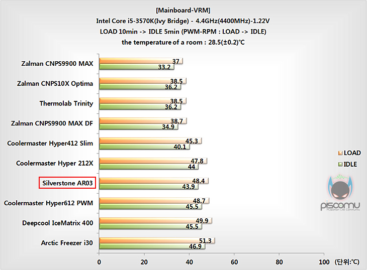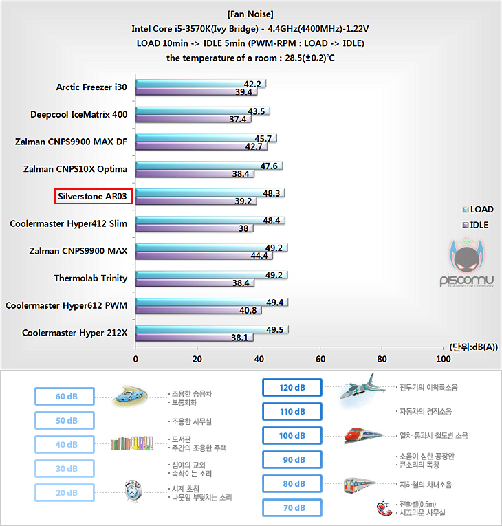 이제, Argon AR03의 성능을 확인해 보는데, 시스템 기반은 인텔 i5-3570K이며, 하이엔드 쿨러 컨셉인 만큼 바로 오버클럭(4.4GHz, 1.22V) 상황에서 진행되며, 프로세서 냉각 성능, 전원부에 쿨링 영향, 팬 속도와 소음 순으로 확인을 해보겠습니다.