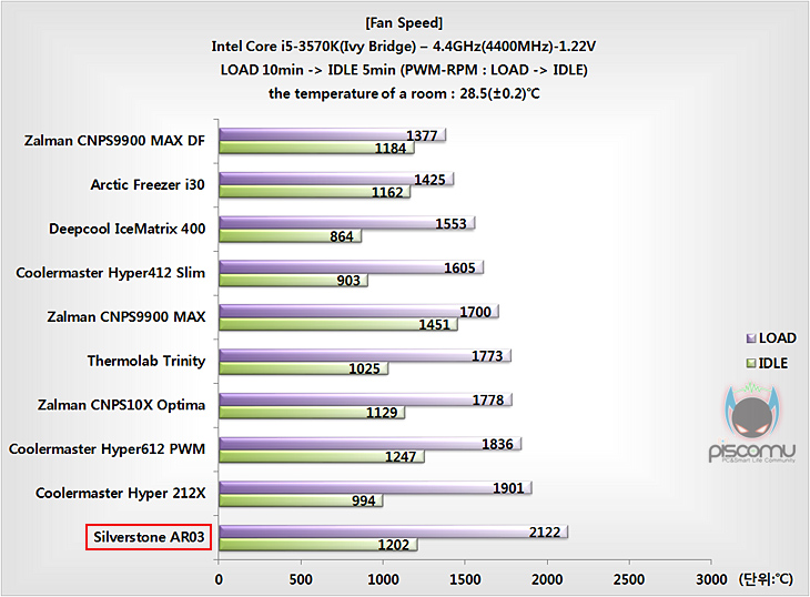 팬 속도를 보면 LOAD 상황에선 최대 속도에 근접하게 동작되는 것을 확인할 수 있으며, IDLE에선 최소 속도보다 약 200RPM 정도 높게 작동된 것을 확인할 수 있습니다. 팬 속도에 따른 프로세서의 냉각 성능이 좋은 반면, 전원부에 크게 미치지 못했다라는 것을 알 수 있습니다. 끝으로, 팬 소음을 측정해 본 결과, 핀 방진패드의 영향으로 속도에 비해 소음은 작은 편임을 확인할 수 있습니다. 특히, IDLE보다는 LOAD에서 소음이 다른 비교모델의 팬 속도보다 높음에도 낮은 편이라 핀 방진패드 효과를 잘 보여준다 할 수 있습니다.