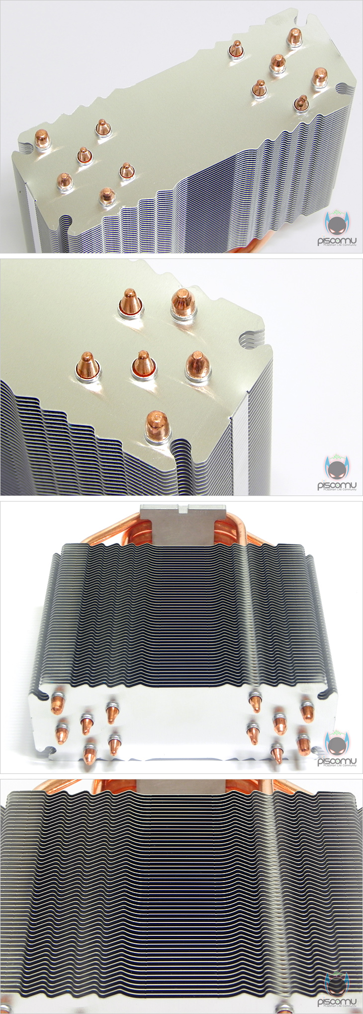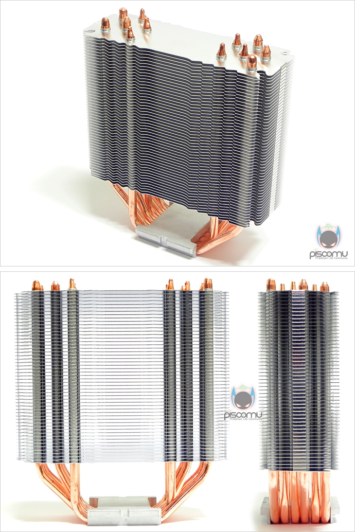 Argon AR03을 살펴보면, 기본적인 구조는 일반 타워형 쿨러와 큰 차이가 없습니다. 히트파이프가 U자 구조로 방열핀을 통과합니다. 쿨러의 높이(H)는 159mm, 전면 폭(W)은 140mm, 뒤로 깊이(D) 폭은 50mm가 되겠습니다. 방열핀을 살펴보면, 방열핀을 통과하는 히트파이프가 왼쪽/오른쪽 각각 6개임을 간접적으로 확인할 수 있으며, 양쪽 측면에는 팬을 장착할 시 사용되는 핀 방진패드를 끼울 수 있는 홈 처리가 되어 있습니다. 방열핀의 디자인은 전후 대칭으로 웨이브 형태로 처리가 되었습니다. 방열핀의 총 개수는 52개입니다.