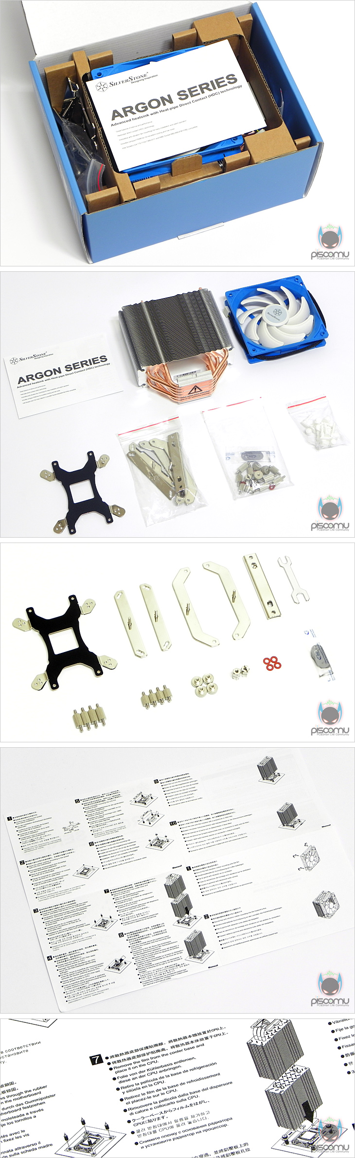 제품 구성은 설명서, Argon AR03 쿨러, 팬(FAN), 백플레이트, 인텔/AMD 클립, 각 종 볼트와 너트, 와셔, 그리고 소량의 써멀컴파운드와 팬 장착에 사용되는 핀 방진패드를 제공해줍니다. 제품 사용설명서에는 역시 한국어가 기본 포함되어 있어 조립 시 쉽게 참고를 할 수 있습니다.