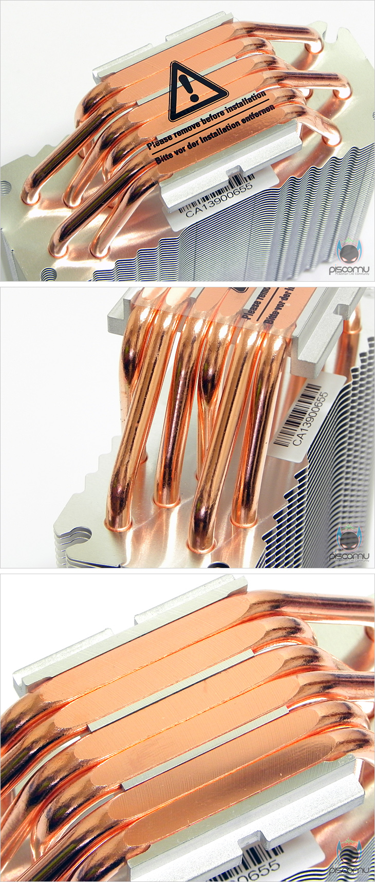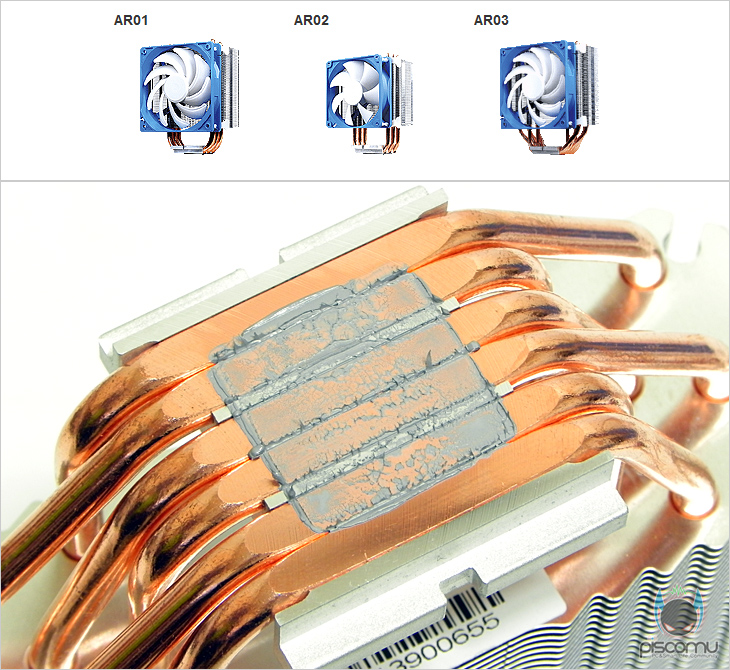 앞서 시작에서 잠깐 언급했듯, 이번 Argon 시리즈는 총 3가지 모델로 나왔습니다. 3가지 모델로 출시된 이유는 성능 차이도 있지만, 인텔 기준에서 볼 때, 소켓에 따른 차이도 있습니다. AR01와 AR02는 LGA775와 LGA115X 소켓에 좀 더 적합하도록 베이스 면적을 가지고 있으며, AR03은 최상위인 LGA 1366/2011에 좀 더 적합하게 되었는데, 실제 사용된 AR03을 확인해 본 결과 LGA115X에서 사용하면 6개의 히트파이프 중 양쪽 맨 끝의 히트파이프는 CPU와 거의 접촉이 되지 않는 것을 확인할 수 있습니다. 성능에도 어느 정도 차이가 있지만, 면적을 고려해서 3가지로 나온 만큼, 선택 시 참고하면 좋겠습니다.