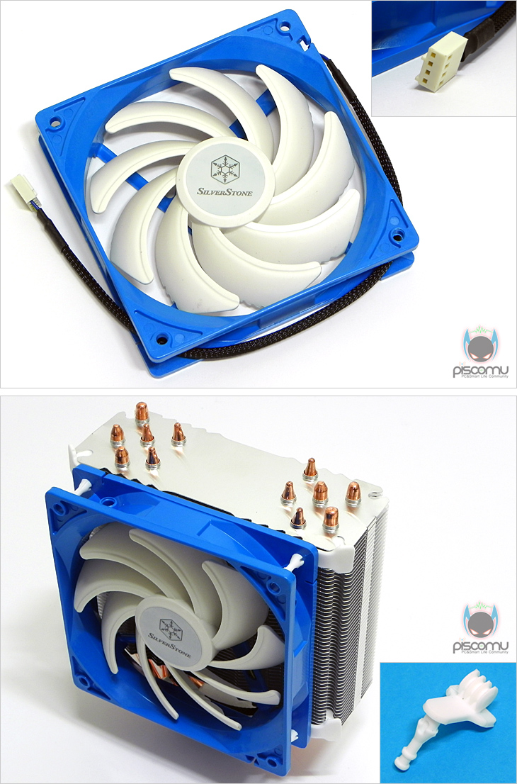 방열핀을 통과하는 히트파이프는 총 6개임을 확인할 수 있으며, 관통식으로 처리가 되었습니다. 그리고, CPU와 맞닿는 베이스 부분은 히트파이프가 직접 접촉되는 앞서 기술에 언급된 HDC(Heat-pipe Direct Contact) 기술로 처리가 되었습니다. 각 제조사마다 표현 방식이 다를 뿐, 경쟁사 제품에서도 흔히 볼 수 있는 방식입니다. 조금 다른 점이라면, 히트파이프 2개씩 분리되어 붙어있다라는 점입니다. 끝으로, 기본 제공되는 팬의 크기는 120mm로 총 9개의 블레이드를 가졌으며, PWM방식으로 작동됩니다. 팬의 속도는 1000~2200RPM으로 일반 저소음 속도보다는 조금 높게 시작되어 소음이 발생되는 높은 속도까지 광범위하게 가졌습니다. 팬 장착은 제공되는 핀 방진패드를 사용해 쿨러 홈에 끼우는 방식으로 쉬운 편입니다.