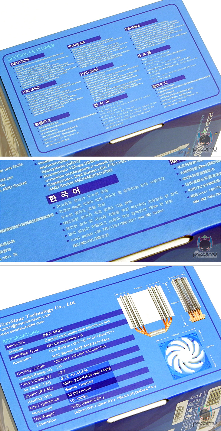 Argon AR03의 제품박스를 살펴보면, 그 동안 실버스톤의 다른 모델들과 달리 박스 디자인이 적용되어 있습니다. 전면 후면에는 각각 해당 모델의 이미지를 삽입했으며, 전면 모델명과 함께 6가지의 제품 특징을 언급하는데, 그 중 HDC(Heat-pipe Direct Contact) 즉, 히트파이프가 CPU와 직접 접촉하는 방식을 가장 핵심적으로 언급합니다. 박스 측면에는 해당 모델의 전/후/측면의 이미지와 제품의 특징 부분을 이미지로 언급해주고 있습니다. 방열핀 디자인, 팬, 방진패드, 히트파이프를 언급합니다. 또다른 측면에선 각 나라별 언어로 제품 특징을 소개하고 있는데, 한국어도 기본 포함이 되어 있어, 앞서 영문 소개의 특징을 좀 더 쉽게 이해할 수 있습니다. 그리고, 반대편에는 해당 제품의 기본 스펙 정보를 확인할 수 있어, 팬 사양과 제품의 크기(Size) 등을 확인할 수 있습니다.