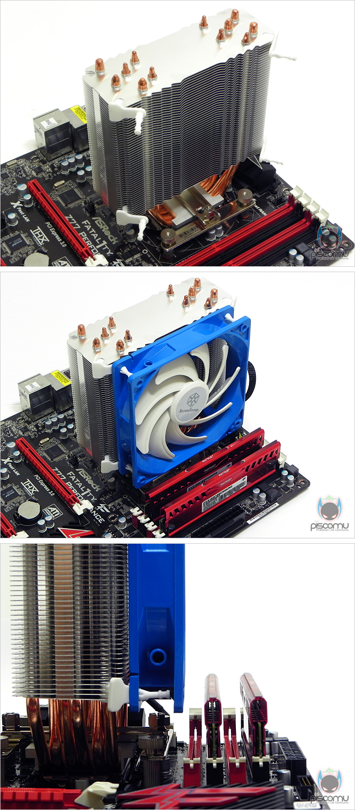 직접, Argon AR03를 사용해 보겠습니다. 먼저, 장착은 사용되는 설명서를 참고하면 어렵지 않게 장착할 수 있는데, 백플레이트와 클립 받침 볼트를 중간에 와셔를 넣어서 결합해줍니다. 그 다음 자신의 프로세서 종류에 따라 인텔용과 AMD용 클립을 올리고 너트로 결합해줍니다. 그 다음은 쿨러를 그대로 올리고, 크로스바를 올려서 클립과 결합시켜 쿨러를 장착해주고, 마무리로 팬을 장착해주면 되겠습니다. 쿨러 장착 후 메모리 슬롯과의 간섭을 확인해 본 결과, 가장 안쪽의 슬롯까지도 간섭이 발생하지 않는 것을 확인할 수 있어, 풀 뱅크로 메모리를 사용할 수 있겠습니다.