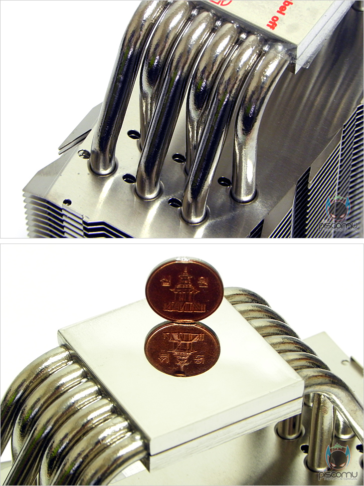 팬을 분리해 쿨러만 좀 더 살펴보면, 외형적인 생김새는 기존 Venomous-X 시리즈와 차이가 없습니다. 트리플 X형태의 방열핀 디자인과 팬 커버가 적용되지만, 예전 방식의 팬 클립도 그대로 유지되어 있습니다. 방열핀의 개수는 기존과 동일한 47개를 사용했으며, Venomous-X의 특징인 방열핀 비대칭형도 이번 모델에 그대로 적용되어 있습니다. 또한, 히트파이프 구조 역시 U자형으로 방열핀을 통과하는 방식으로 이전 모델들과 동일합니다. 히트파이프 역시 총 6개 사용으로 동일하며, 지름은 6mm가 되겠습니다. 또한, 방열핀읕 통과하는 처리는 솔더링 기법으로 처리 되었습니다. CPU와 맞닿는 베이스 부분의 래핑은 사물이 비칠정도로 아주 매끄럽게 되어 있습니다.