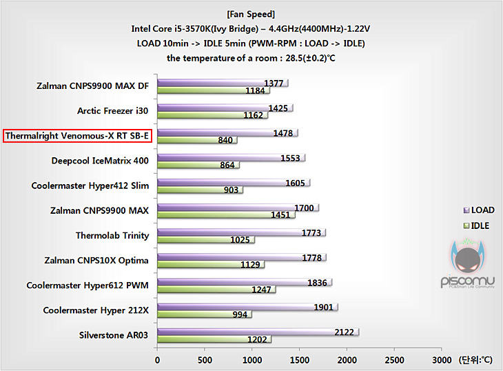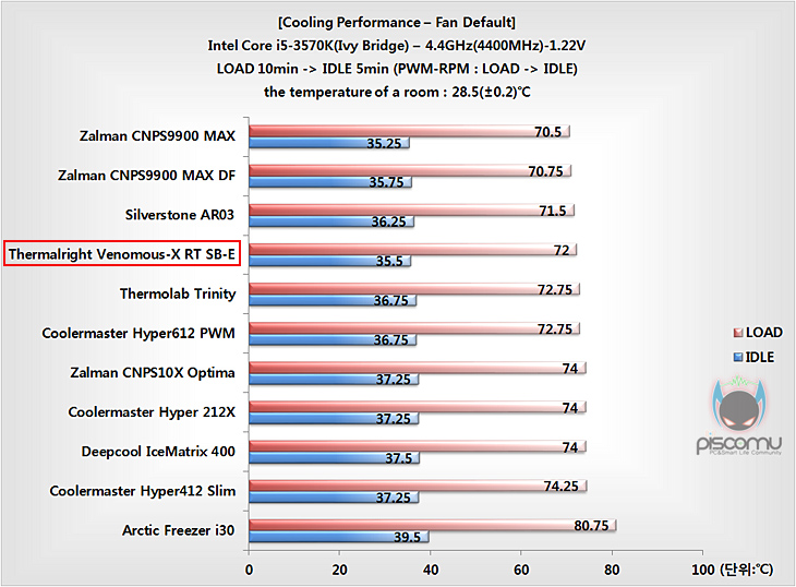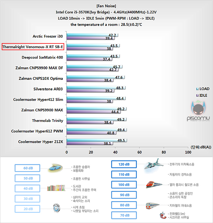 그럼, Venomous-X RT SB-E의 프로세서 냉각 성능을 확인해보는데, 시스템 기반은 인텔 아이비브릿지 i5-3570K이며, Venomous-X시리즈는 하이엔드 쿨러이기 때문에 Venomous-X RT SB-E 역시 바로 오버클럭(4.4GHz, 1.22V) 상황에서 진행이 되겠습니다. 프로세서 냉각 성능, 전원부에 미치는 쿨링영향, 팬 속도와 소음 순으로 확인을 해보겠습니다.