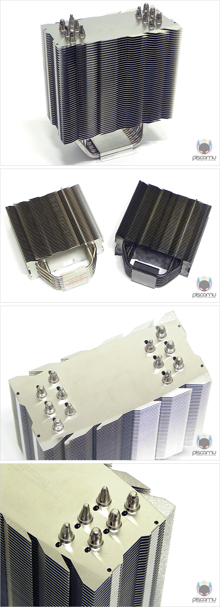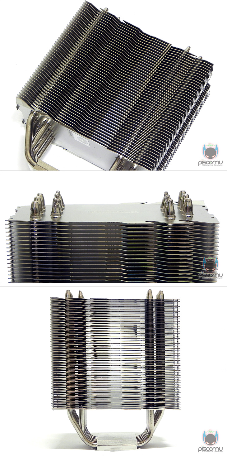 팬을 분리해 쿨러만 좀 더 살펴보면, 외형적인 생김새는 기존 Venomous-X 시리즈와 차이가 없습니다. 트리플 X형태의 방열핀 디자인과 팬 커버가 적용되지만, 예전 방식의 팬 클립도 그대로 유지되어 있습니다. 방열핀의 개수는 기존과 동일한 47개를 사용했으며, Venomous-X의 특징인 방열핀 비대칭형도 이번 모델에 그대로 적용되어 있습니다. 또한, 히트파이프 구조 역시 U자형으로 방열핀을 통과하는 방식으로 이전 모델들과 동일합니다. 히트파이프 역시 총 6개 사용으로 동일하며, 지름은 6mm가 되겠습니다. 또한, 방열핀읕 통과하는 처리는 솔더링 기법으로 처리 되었습니다. CPU와 맞닿는 베이스 부분의 래핑은 사물이 비칠정도로 아주 매끄럽게 되어 있습니다.