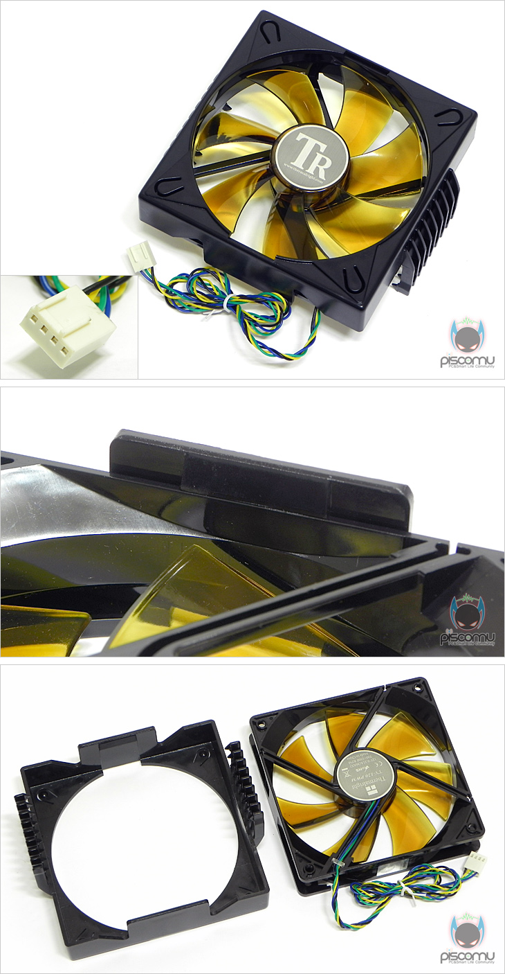 Venomous-X RT SB-E를 살펴보면, 역시 가장 먼저 눈에 띄는 부분은 전면 기본 장착된 팬 입니다. 기존의 모델에선 팬이 제공되지 않았고, 저소음 모델에서만 제공되었기 때문에 이번 모델은 특별히 팬에 대한 비용이 없겠습니다. 팬은 커버와 함께 사용되어 쿨러 측면 걸쇠 방식으로 장착되어 있습니다. 커버를 분리해 팬을 살펴보면, 기본 7개 블레이트에 PWM 연결방식으로 작동되겠습니다. 또한, 팬은 커버의 걸쇠 방식으로 장착이 되어있어 커버와 팬 쉽게 분리를 할 수 있습니다.
