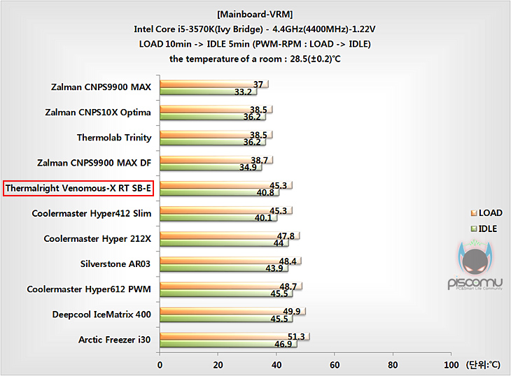 먼저, Venomous-X RT SB-E의 프로세서 냉각 성능을 확인해 보면, Prime95를 10분간 LOAD, 종료 후 5분간 IDLE로 진행된 상황에서 온도를 확인한 결과, 상위 수준의 성능을 보여주는 것을 확인할 수 있습니다. 명성대로 성능을 보여준다 할 수 있습니다. 진행 동안 메인보드 전원부에 미치는 쿨링 영향은 크지 않지만, 어느정도 영향은 주고 있어 준수한 편이라 할 수 있습니다.