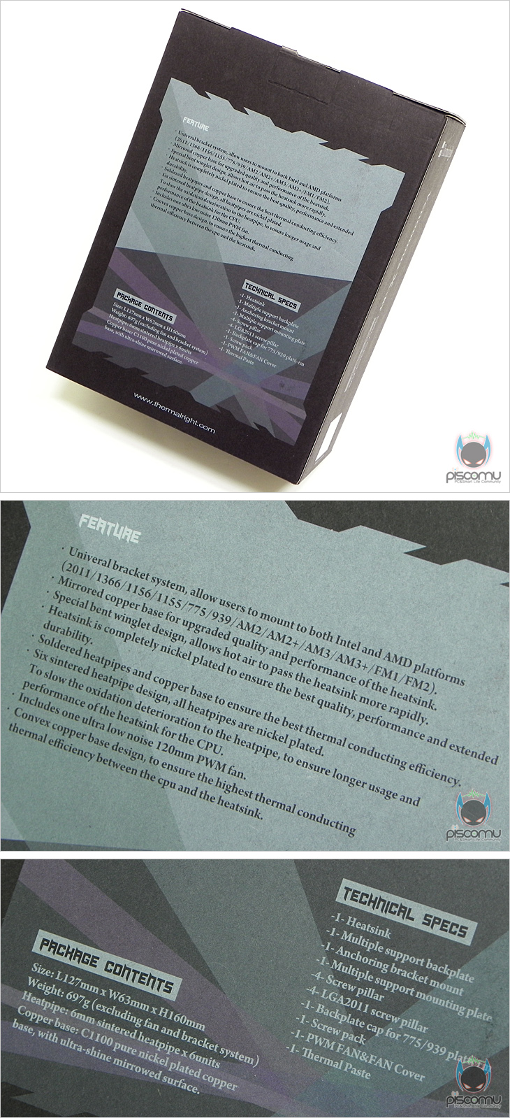 제품 포장은 내부 속박스 적용으로 깔끔하게 되어 있으며, 설명서를 비롯해 쿨러, 부속품이 담긴 팩으로 이루어져 있습니다. 부속품에는 인텔/AMD 공용 백플레이트 및 마운트, 마운팅 플레이트, 볼트와 너트, 와셔, LGA775용 백플레이트 캡, 소량의 써멀 컴파운드를 제공해줍니다.