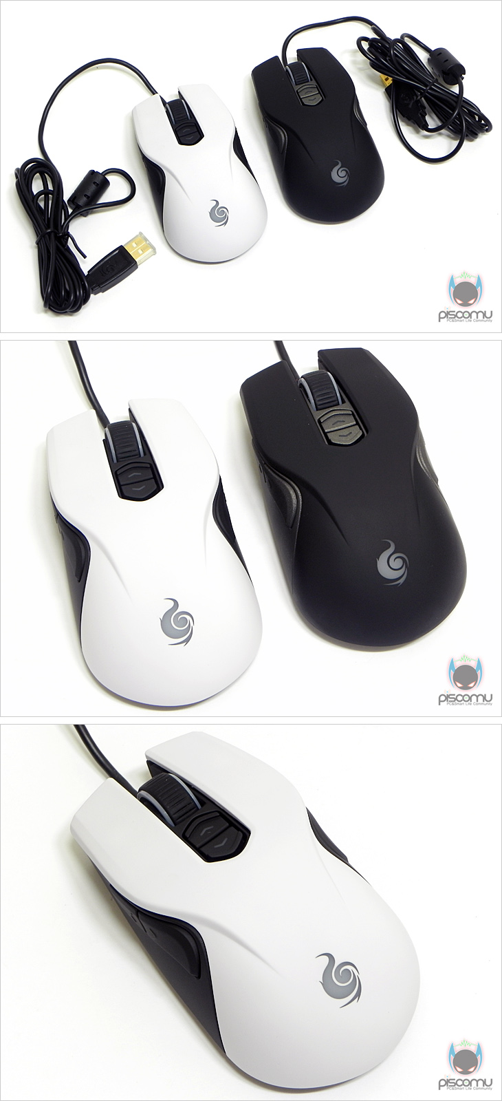 RECON 화이트를 살펴보겠습니다. 기존 RECON 기본 모델과 비교하면, 색상차이가 가장 눈에 띄는 것을 확인할 수 있습니다. 물론, 그 외 나머지 부분의 색상이 부분적으로 차이가 있습니다. 그리고, 기존 모델과 마찬가지로 표면 코팅은 러버 코팅이며, 무광으로 처리가 되어 있습니다. RECON 화이트 역시 디자인부분은 바뀌지 않았기 때문에 좌우대칭으로 오른손/왼손 모두 사용이 가능하며, 기본 좌우 버튼과 휠-버튼, DPI버튼 모두 동일한 디자인과 위치에 배치되어 있습니다. 단, DPI 버튼 부분의 색상 경우 기존 모델에선 크롬 색상이지만, 화이트 모델에선 블랙으로 적용이 되었습니다. 참고로 DPI는 800/1600/3200/4000DPI 4단계로 조절되며, 좌우 버튼의 내부 스위치는 기존과 동일한 옴론(Omron)사 스위치가 적용되어 있습니다. 마우스 측면을 살펴보면, 측면 역시 기존 모델과 동일하게 좌우측면 모두 2버튼씩 배치가 되어 있습니다. 양쪽 버튼 모두 기본 기능은 웹-브라우저 앞/뒤 기능입니다. 그리고, 역시 기존 모델에선 색상 처리를 크롬색으로 했지만, RECON 화이트에선 블랙으로 처리했습니다. RECON 화이트 마우스 밑면 역시 기존 모델과 동일하게 앞뒤 자리에 부드러운 움직임을 위해 테프론 피트를 기본 부착했으며, 가운데는 광 센서가 배치되어 있는데, 기존 모델과 동일하기 때문에, 기존 모델의 내부를 참고로 살펴보면, 센서는 박스에서도 표기되었듯, Avago사의 A3090칩이 적용되었으며, 좌우 버튼 역시 앞에서 잠깐 얘기했듯, 옴론(Omron)사 스위치가 적용되었습니다. 그리고, USB 연결인터페이스를 지원하기 때문에 USB 컨트롤러칩에는 Cypress사 칩이 적용되었습니다. 이 밖에, 휠-버튼 양쪽 LED효과를 위해 휠 안쪽에 LED칩에 들어가는 구조와 DPI 변경 버튼과 측면 버튼에 사용된 스위치가 TTC 스위치인 것도 추가로 확인할 수 있습니다. 끝으로, 케이블 부분을 살펴보면, 케이블 역시 기존 모델과 마찬가지로 1.8m의 길이와 함께 피복처리 되어있으며, USB 연결 인터페이스와 함께 포트 캡이 씌워져 있습니다. 그리고, 신호손실 최소화를 위해 포트 금도금 처리와 케이블 끝 부근에 필터 적용을 기존과 동일하게 적용했습니다.