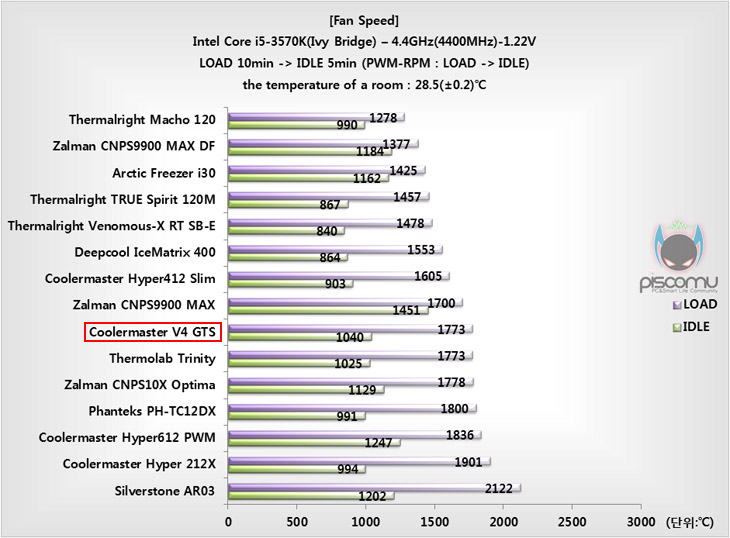 끝으로, 진행 동안의 팬 속도와 소음을 확인해보는데, 먼저 속도 경우 LOAD상황에서 팬 최대 속도 범위에 근접하게 작동된 것을 확인할 수 있습니다. 반면, IDLE에선 최소 속도보다 약 400RPM 좀 더 높게 작동되는 것을 확인할 수 있습니다. 비교 쿨러들과 비교했을 때, 속도수준은 중간 정도라 할 수 있습니다. 하지만, 듀얼 팬을 기본적으로 구성하기 때문에, 소음부분에서 높은 결과를 보여줬습니다. 전체 비교 쿨러들 중 가장 높은 소음대로 약 53dB(A)를 보여줬는데, 이는 팬의 최대 속도와 듀얼 팬인점을 감안하면 당연한 결과라 할 수 있습니다. 그래도, 냉각 성능까지 전체적으로 고려해보면, V4 GTS의 전체적인 성능 만족도는 높은 편이라 할 수 있습니다.
