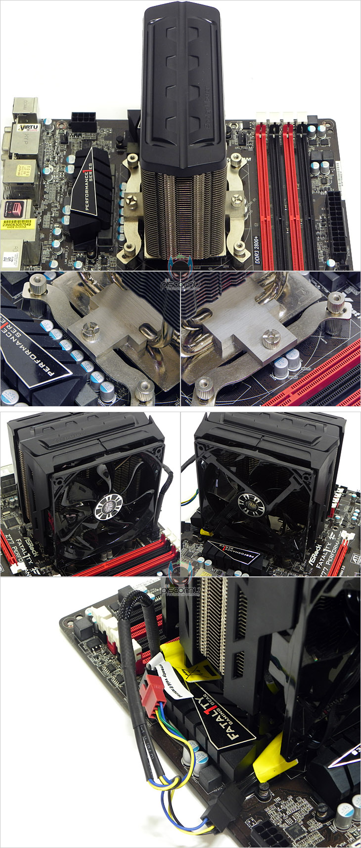 이제, 직접 V4 GTS를 사용해 성능을 확인해보는데, 확인에 앞서 장착을 해보겠습니다. 장착법은 최근 출시되는 자사의 제품들과 거의 동일한 방식으로 좀 더 간편해졌습니다. 인텔 기준으로 설명하면, 먼저 백플레이트를 자신의 프로세서 소켓 규격에 맞춰 설정한 후 메인보드 후면에 끼웁니다. 그 다음 리텐션플레이트를 올릴 수 있게 볼트를 결합한 후, 볼트 위에 리텐션플레이트를 올려줍니다. 그리고, 다시 너트를 사용해 리텐션플레이트를 고정해줍니다. 그 다음, 쿨러를 팬을 분리한 상태에서 그대로 올려, 베이스 상위에 있는 마운트에 너트를 사용해 리텐션플레이트 중앙에 있는 볼트부분과 결합해주면 기본 장착이 끝납니다. 그 후 다시 팬을 장착해주고, 기본적으로 듀얼팬을 구성할 수 있기 때문에, 제공되는 Y자 연장케이블을 사용해 팬이 함께 작동되도록 해줍니다.