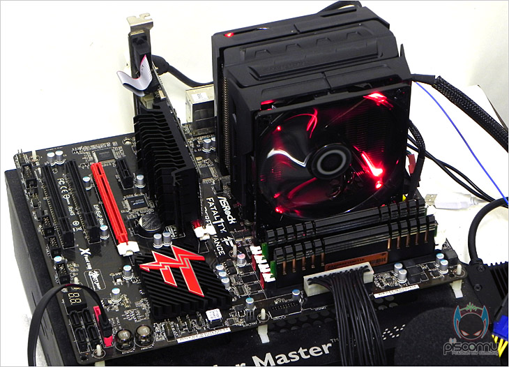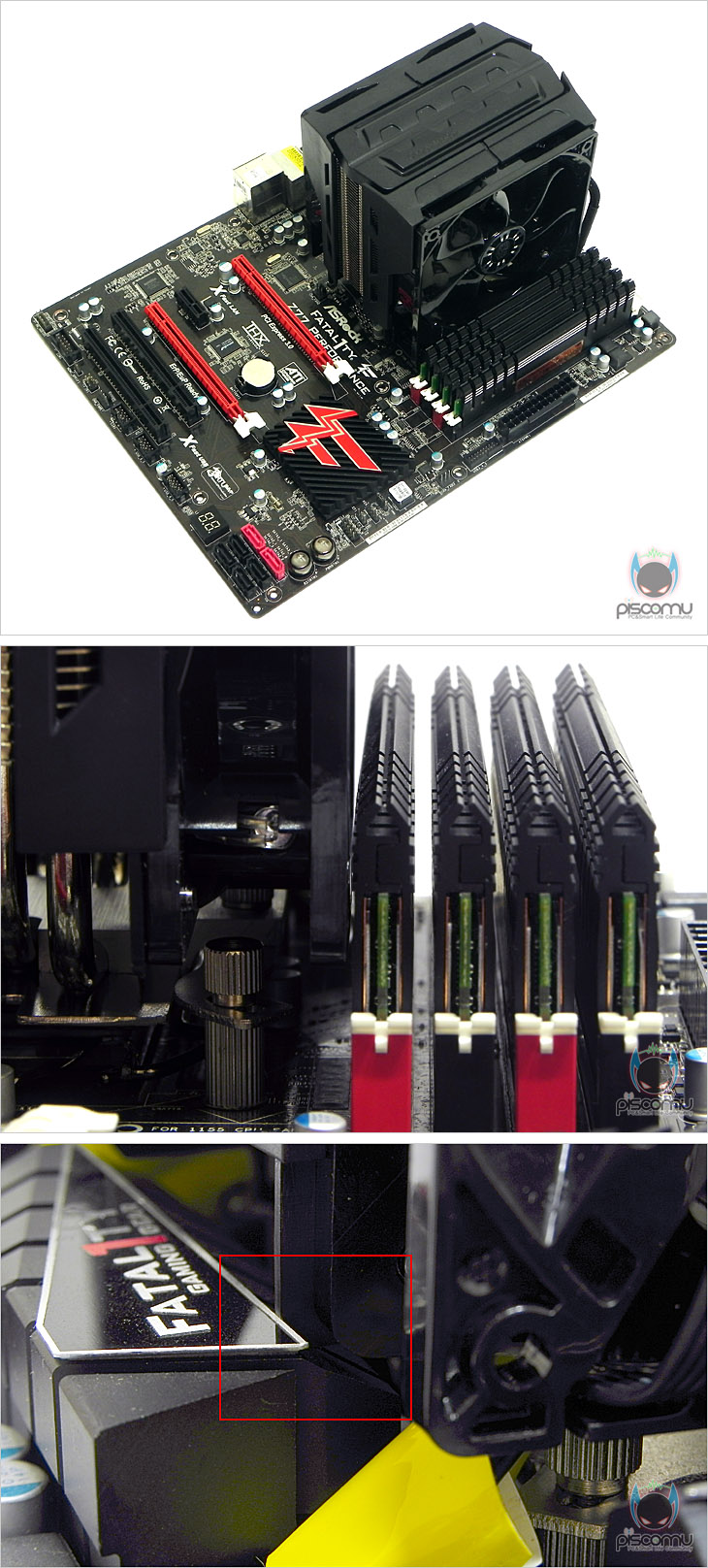 장착 후, 간섭 여부를 확인해 보면, V4 GTS 경우 앞서 언급했듯이, 기존의 쿨러들보다 팬의 위치가 낮은 편으로, 메모리 간섭이나 메인보드 전원부의 방열판 간섭이 발생할 수 있는데, 일단 적용된 메인보드에서 메모리 간섭은 발생하지 않았습니다. 하지만, 메인보드 전원부 방열판 경우 비교적 낮은 높이를 가진 방열판이지만, 거의 닿을 듯, 말듯한 수준으로 간섭이 발생하지 않아, 메인보드 종류에 따라 간섭 우려를 고려해서 선택해야 하겠습니다.
