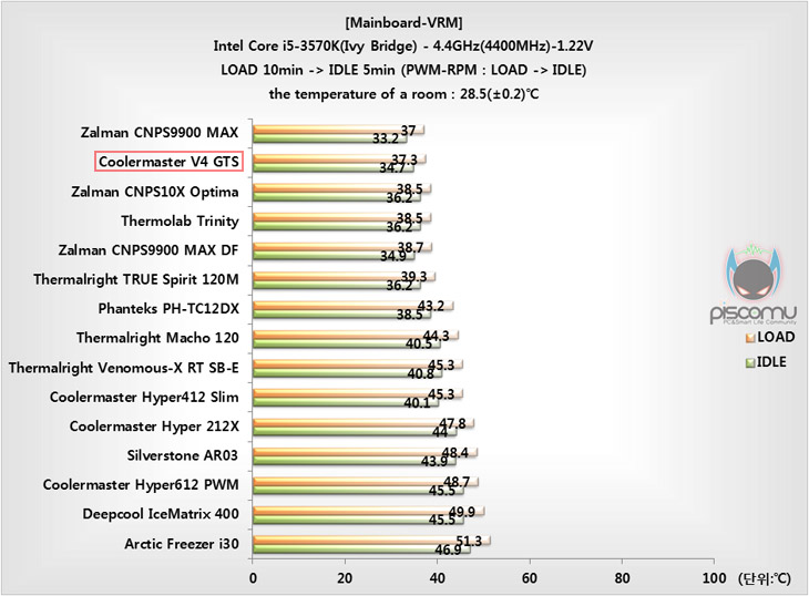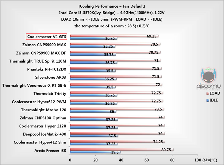 이제, V4 GTS의 냉각 성능을 확인해보겠습니다. 시스템 기반은 인텔 아이비브릿지(i5-4570K)이며, 타워형 쿨러이기 때문에 바로, 오버클럭(4.4GHz) 상황에서 진행되겠습니다. 진행은 Prime95를 10분간 실행한 LOAD상황에서 프로그램 종료한 IDLE로 5분간 돌아가는 방향으로 진행됩니다.