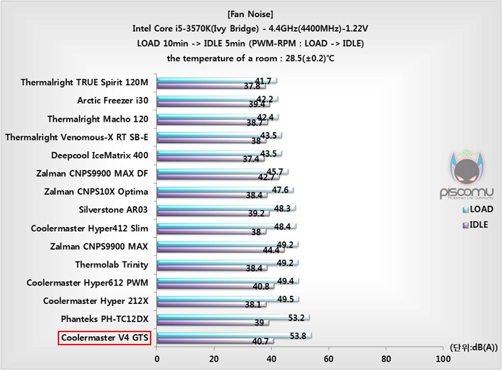 끝으로, 진행 동안의 팬 속도와 소음을 확인해보는데, 먼저 속도 경우 LOAD상황에서 팬 최대 속도 범위에 근접하게 작동된 것을 확인할 수 있습니다. 반면, IDLE에선 최소 속도보다 약 400RPM 좀 더 높게 작동되는 것을 확인할 수 있습니다. 비교 쿨러들과 비교했을 때, 속도수준은 중간 정도라 할 수 있습니다. 하지만, 듀얼 팬을 기본적으로 구성하기 때문에, 소음부분에서 높은 결과를 보여줬습니다. 전체 비교 쿨러들 중 가장 높은 소음대로 약 53dB(A)를 보여줬는데, 이는 팬의 최대 속도와 듀얼 팬인점을 감안하면 당연한 결과라 할 수 있습니다. 그래도, 냉각 성능까지 전체적으로 고려해보면, V4 GTS의 전체적인 성능 만족도는 높은 편이라 할 수 있습니다.